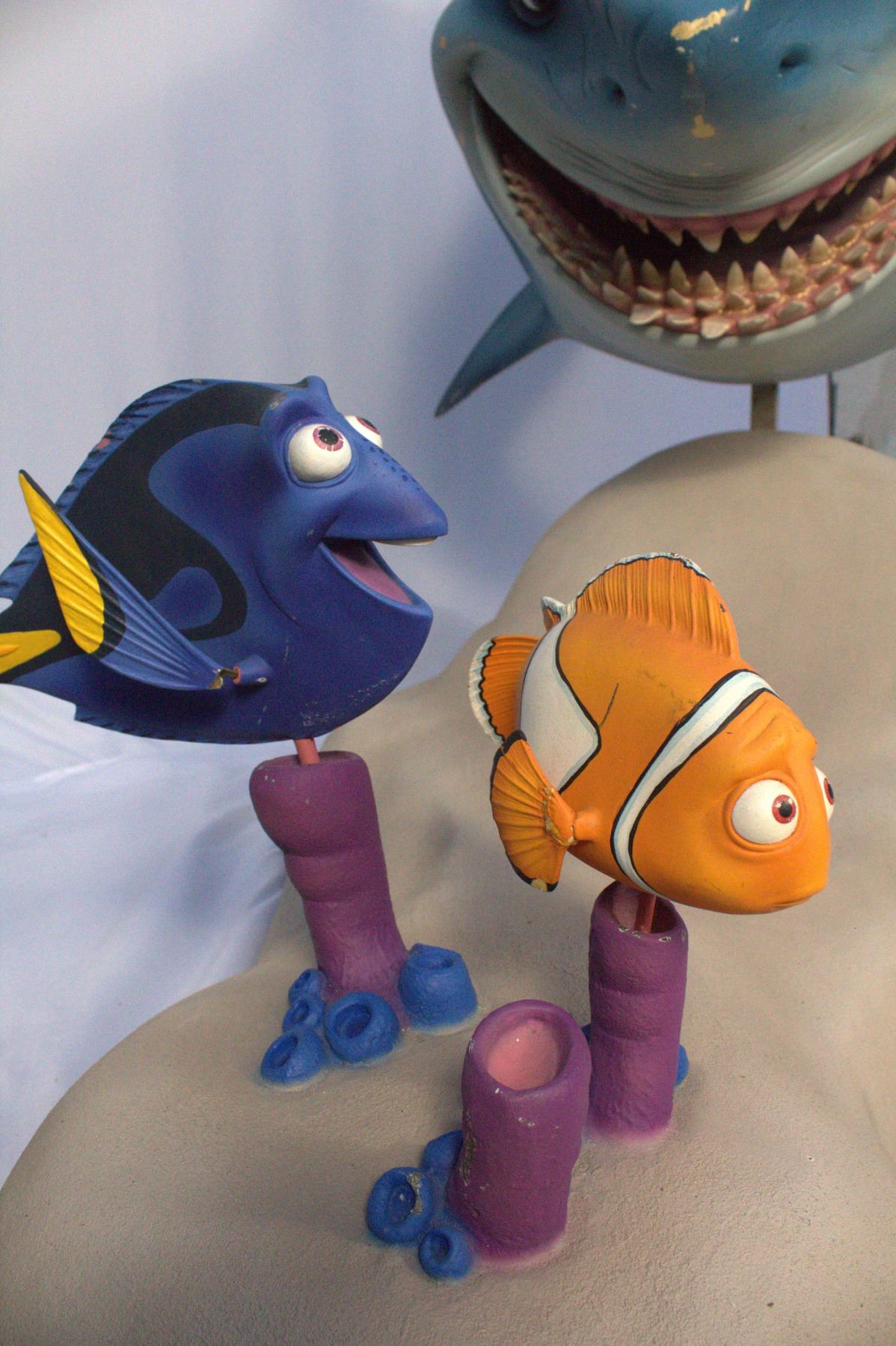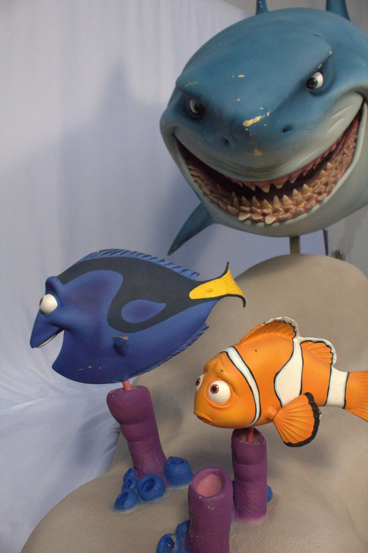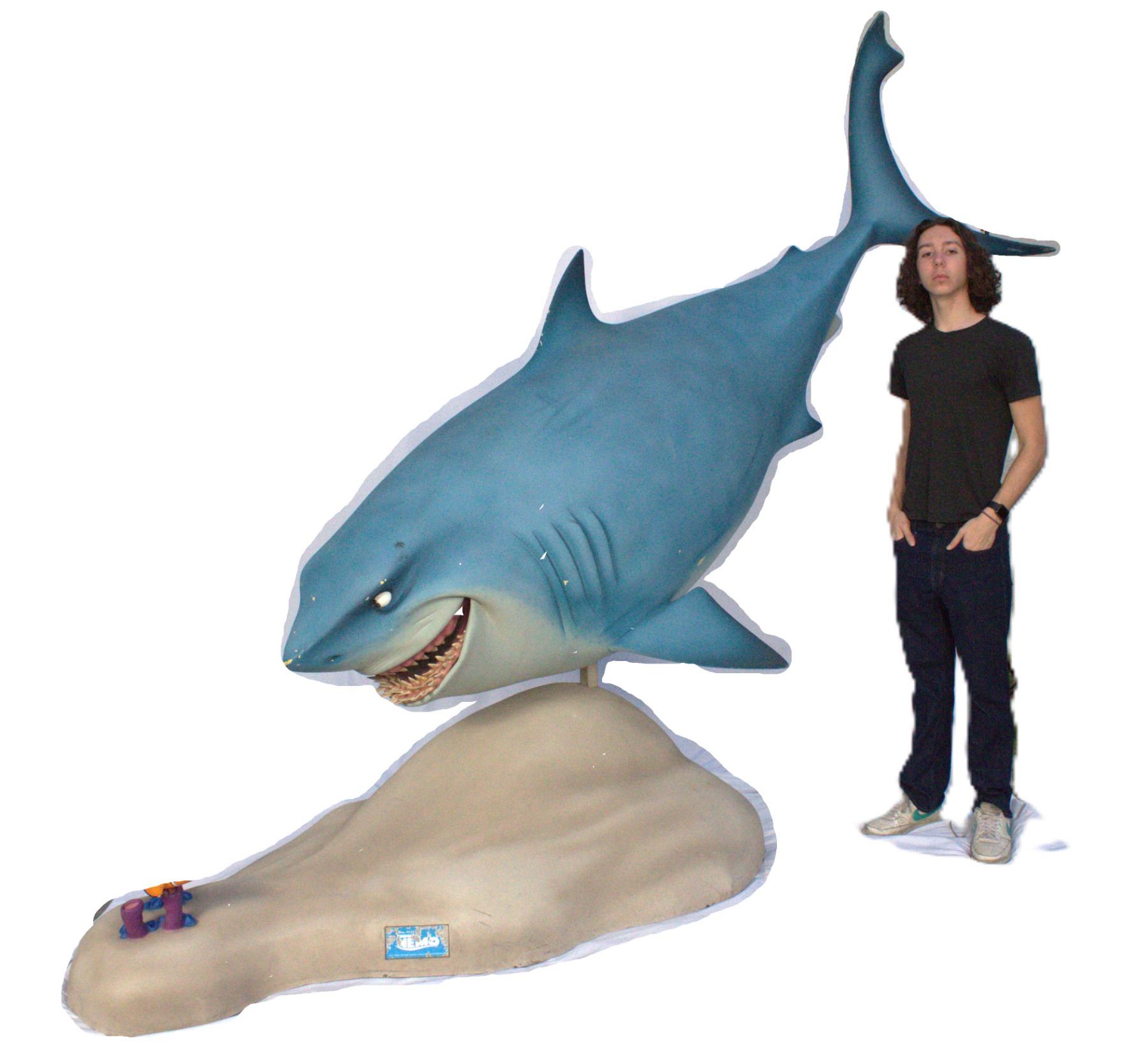 (Disney/Pixar, 2003) This larger-than-life display features Bruce the Shark meeting Marlin the Clownfish and Dory the Blue Tang. Bruce's tail fin reaches over 8 feet high and the dislay is almost 10 feet wide. As any older shark does, Bruce has some scars and loose teeth from world travel. One of Dory's fins is missing and Marlin has a fin that has been repaired.