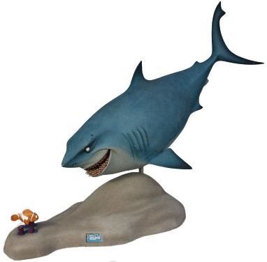 (Disney/Pixar, 2003) This larger-than-life display features Bruce the Shark meeting Marlin the Clownfish and Dory the Blue Tang. Bruce's tail fin reaches over 8 feet high and the dislay is almost 10 feet wide. As any older shark does, Bruce has some scars and loose teeth from world travel. One of Dory's fins is missing and Marlin has a fin that has been repaired.