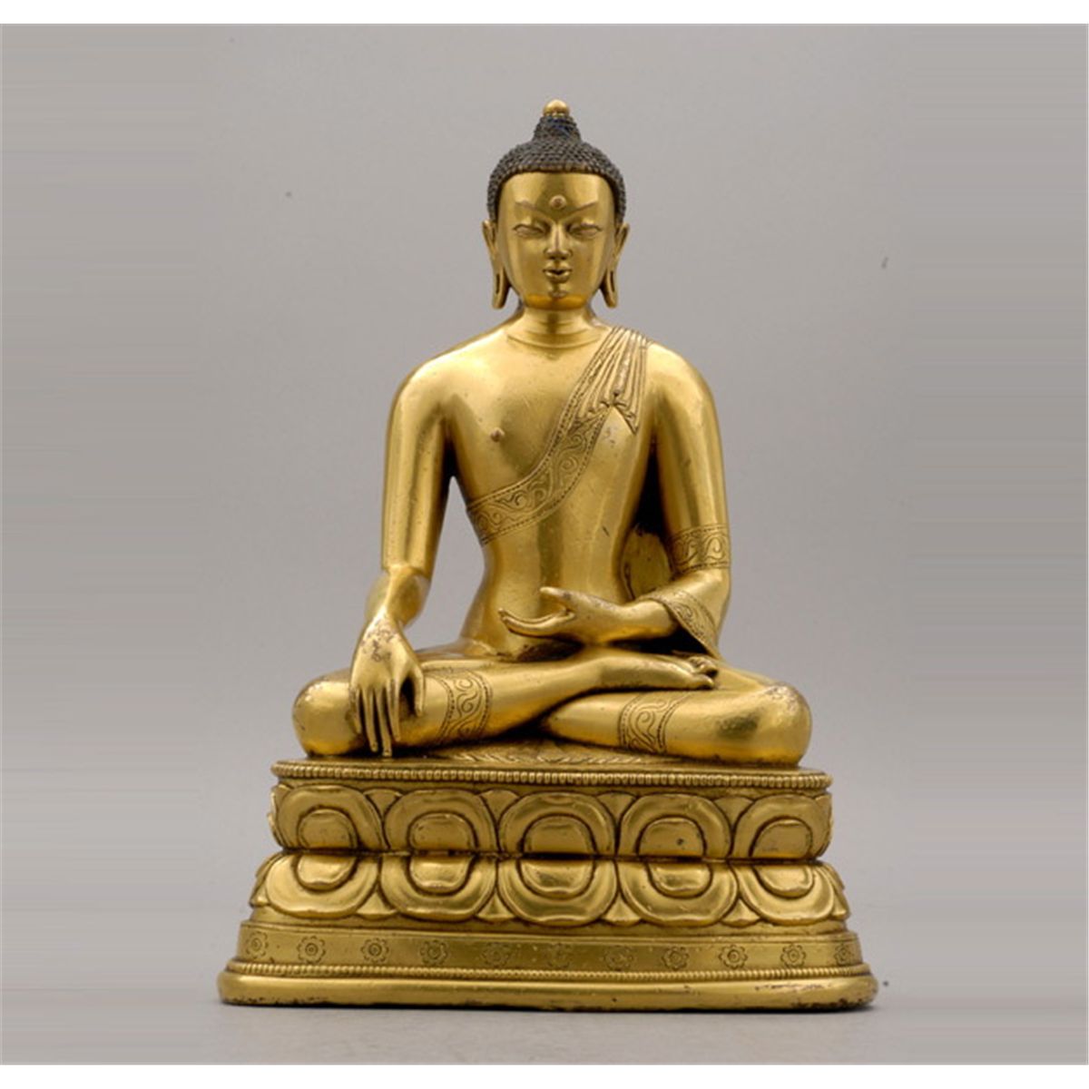 ,A Gilt-Bronze Seated Figure of the Buddha Sakyamuni The figure finely cast seated in vajrasana on a rounded double lotus base, with his right hand in bhumisparsamudra, his left hand in dhyanamudra, wearing a simple softly pleated robe draped over the left shoulder and falling in rounded folds on the base, his face with a benign expression with eyes downcast, the long pendulous ears cut with vertical slits, and the hair arranged in regular rows of tight 'snail curl' whorls surmounted by a domed usnisa. Qing Dynasty, Height: 8 3/8 inches (21.3 cm) [Wear to gilding, minor scratches. This condition report states major condition issues only.]
