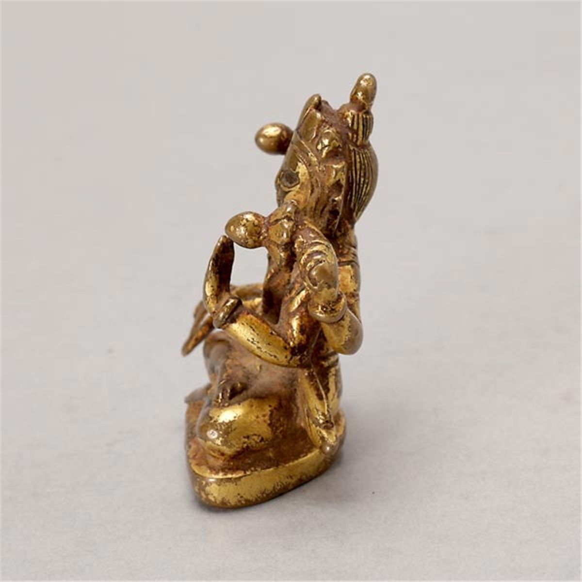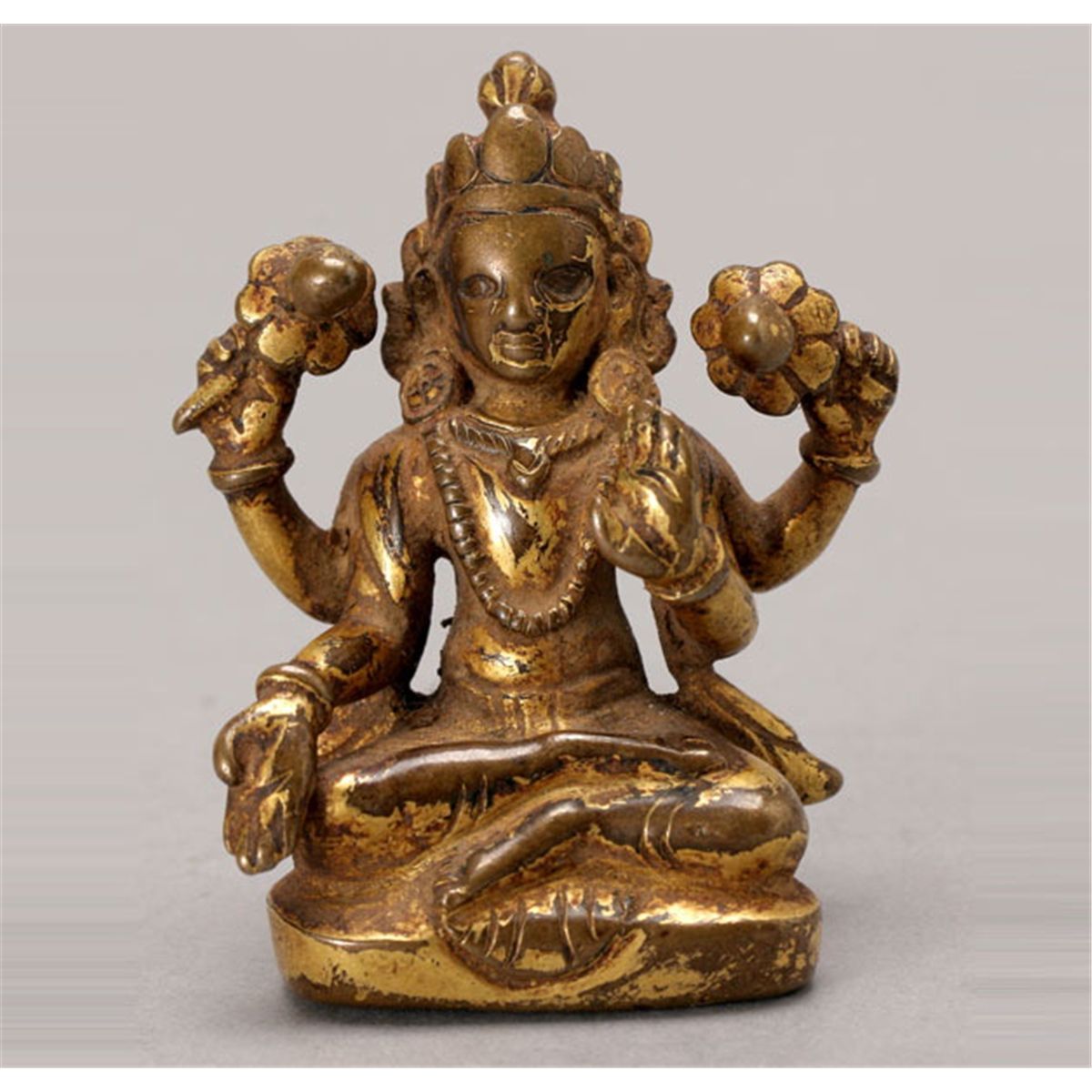 A Small Gilt Copper Figure of Four-Armed Avalokiteshvara, Seated in padmasana, the Bodhisattva of infinite compassion wearing a five-pointed crown, heavily jeweled, his scarf sweeping around his shoulders, his two primary arms in abhaya mudra, the other two arms each holding a padma. Himalayan or South Asian, 15th/16th Century, Height: 2 1/4 inches (5.7 cm) [Wear to surfaces, Good patina. This condition report states major condition issues only.]