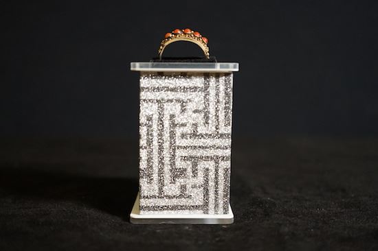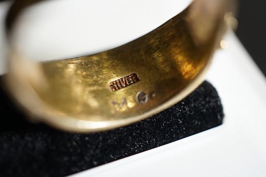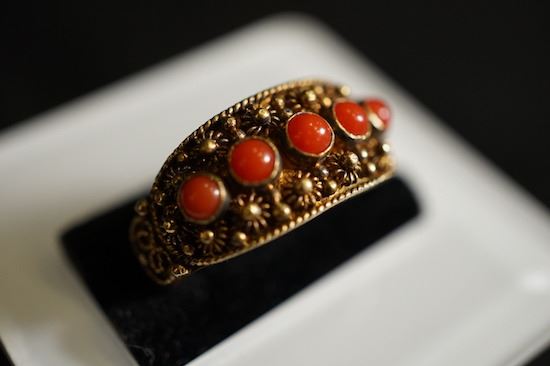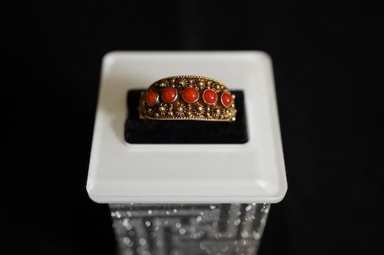 A Gilt-Decorated Silver Ring Mounted in Precious Natural Red Coral. Adjustable Ring Opening