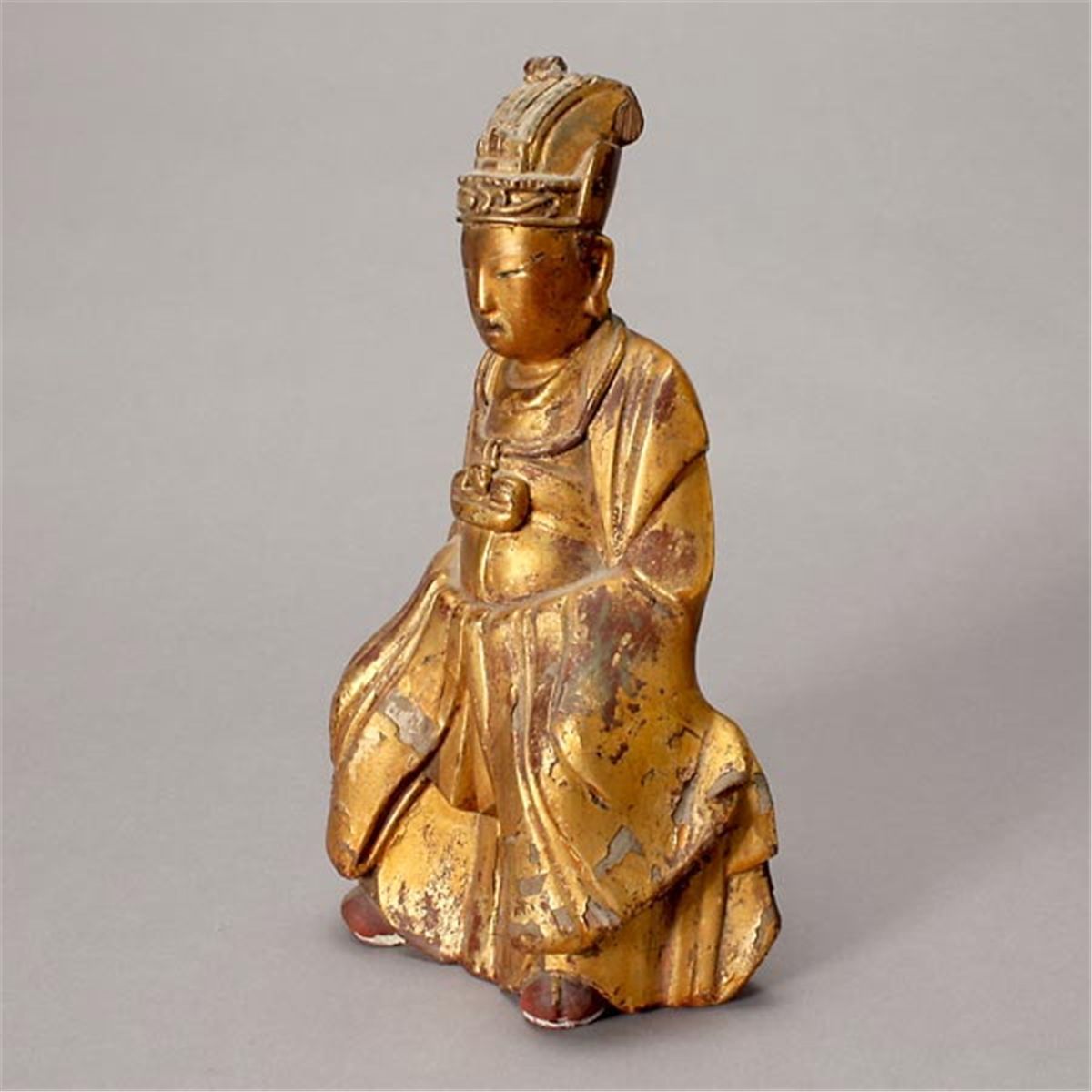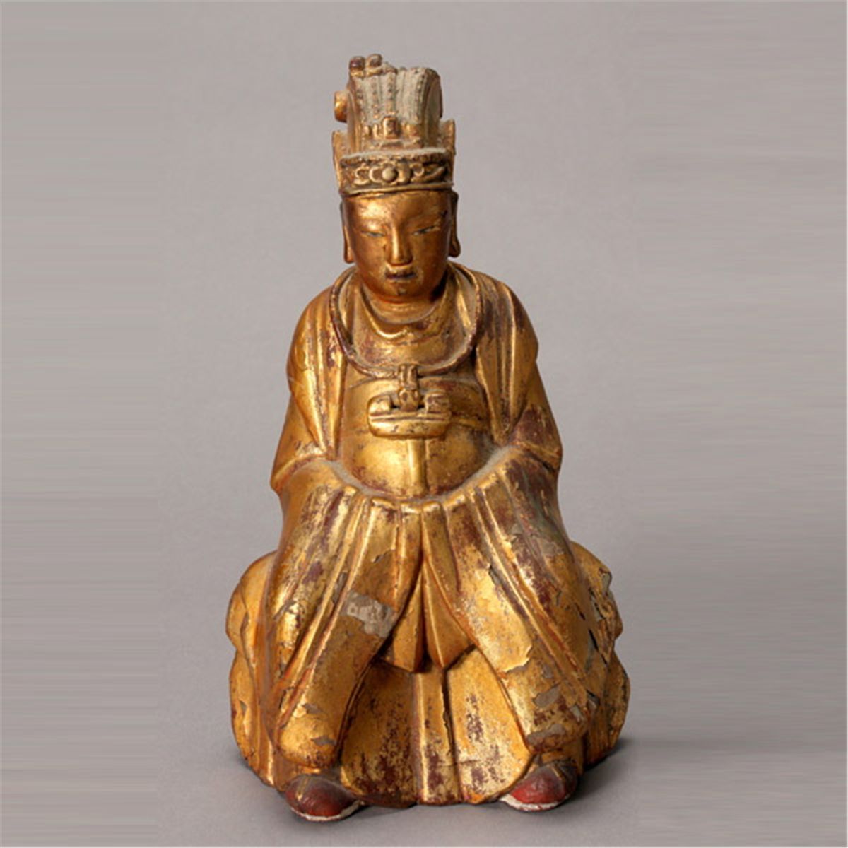 A Gilt Wood Official, wearing draping garments, a stylized hat and large necklace {Height: 9 3/4 inches (24.7 cm)} Provenance: From an East Bay Estate. [Wear, chips to gilt paint, cracks, minor losses]