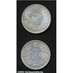 <B>A Gin-marked pair of 1 Yen including:</B></I> Meiji 27 (1894), Gin left (Osaka Mint), KM-Y28a.2, BU with contact marks; and a Meiji 29 (1896), Gin right (Tokyo Mint), KM-Y28a.5, Choice AU. 2 coins <BR><BR><B>Important notice:</B> Heritage usually auctions material at the rate of 200-250 lots per hour. On some occasions eBay Live bid software or the Internet may not be able to keep up with the pace of the auction. We recommend placing a realistic absentee bid now as insurance to avoid disappointment. Occasionally the auctioneer may eliminate or reject an eBay Live bid, and the auctioneer may also reopen a lot after the close of the eBay live bidding (usually because we missed an audience bid), and may reject your bid even if it shows you as the winning bidder. By bidding via eBay Live, you agree that Heritage may award the lot to another bidder at its sole discretion under the circumstances described above or any other reasonable circumstances. Since eBay bids are not shown to us until we open the lot on the floor, we treat those bids just like floor bids. In most cases the floor responds before the eBay bid is presented to us, due to Internet lag time, so for consistency we have made it a policy that floor bids are always considered first over tie eBay live bids. Also please note that all Heritage lots purchased through eBay Live carry a 20% Buyer's Premium. Please make sure you read the Terms and Conditions before you bid.