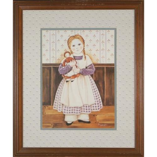 ?A Girl with a Doll? captures a little girl holding her doll, looking as though she were a doll herself. This capturing picture would be a lovely addition to a home or office. This picture measures a total of 24.5?x 20.5? and displays an expert use of composition to bring this brilliant image to life. This very excellently captured picture is complimented by a sleek, mahogany beveled wood frame and has a floral printed blue mat with a gray under-mat that compliments the wallpaper in the background. This print is simply outstanding and is remarkably priced.