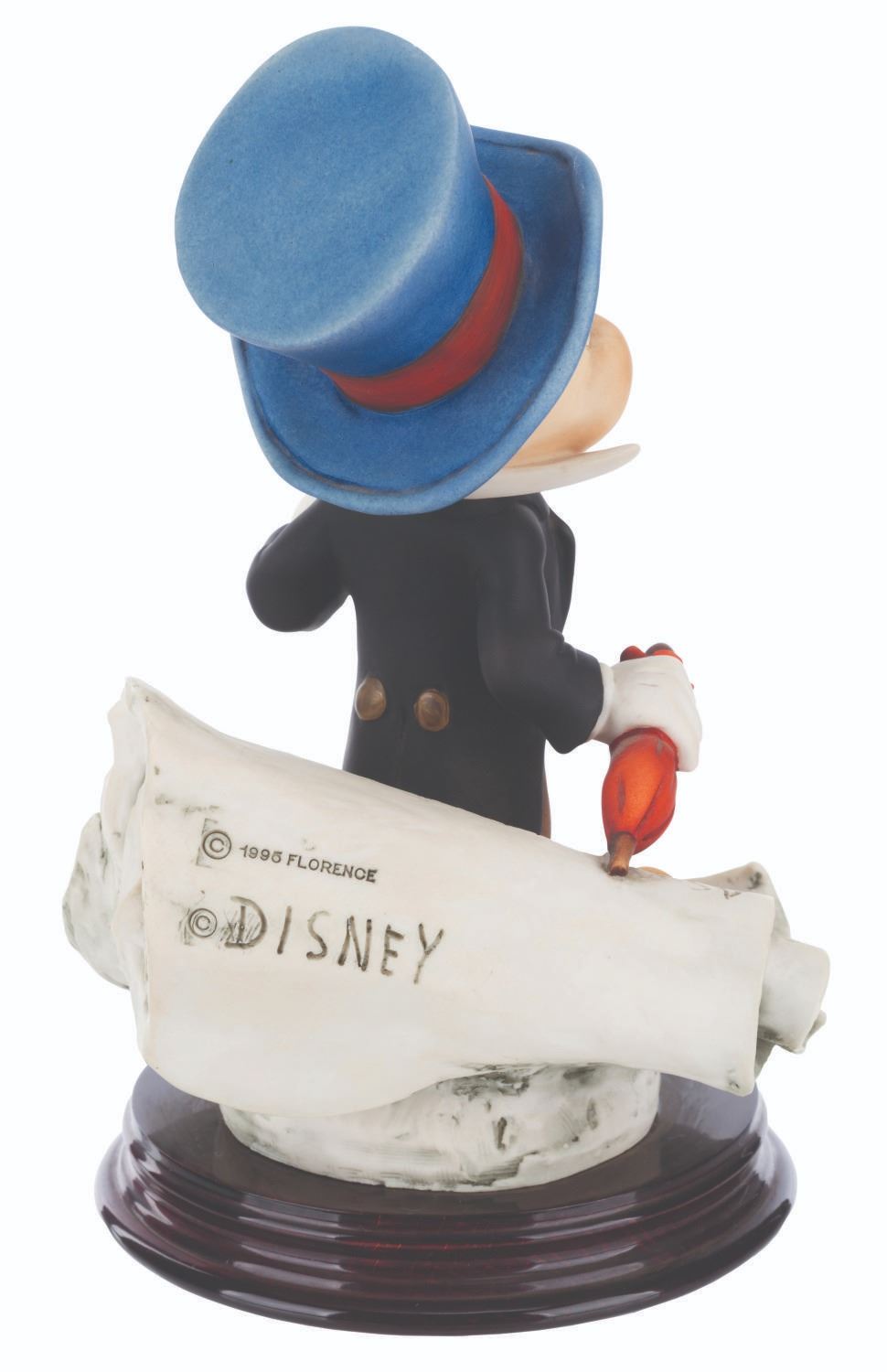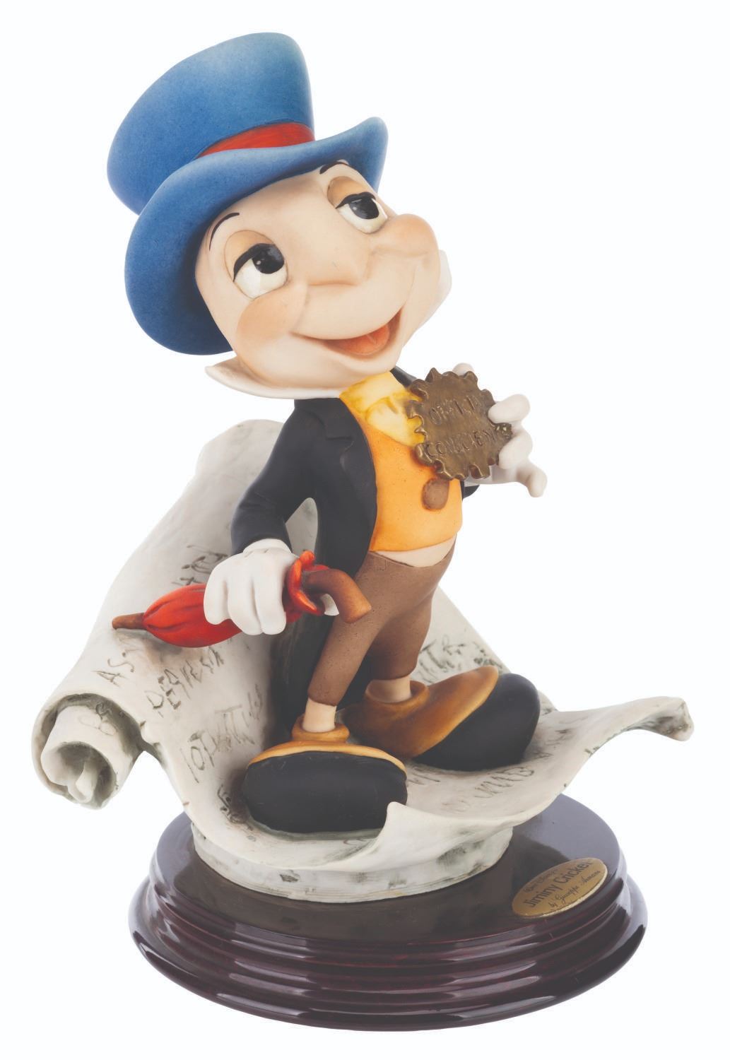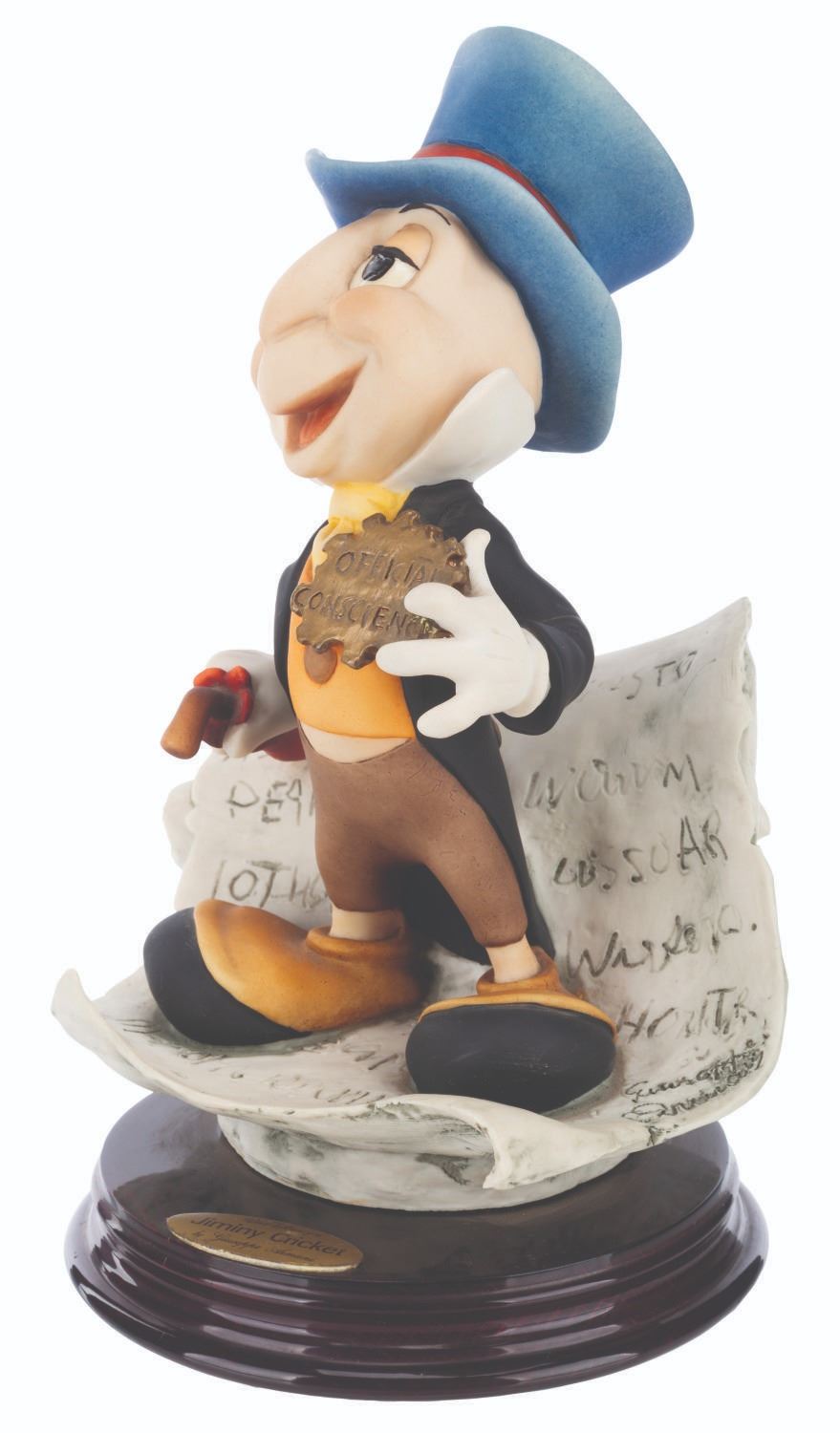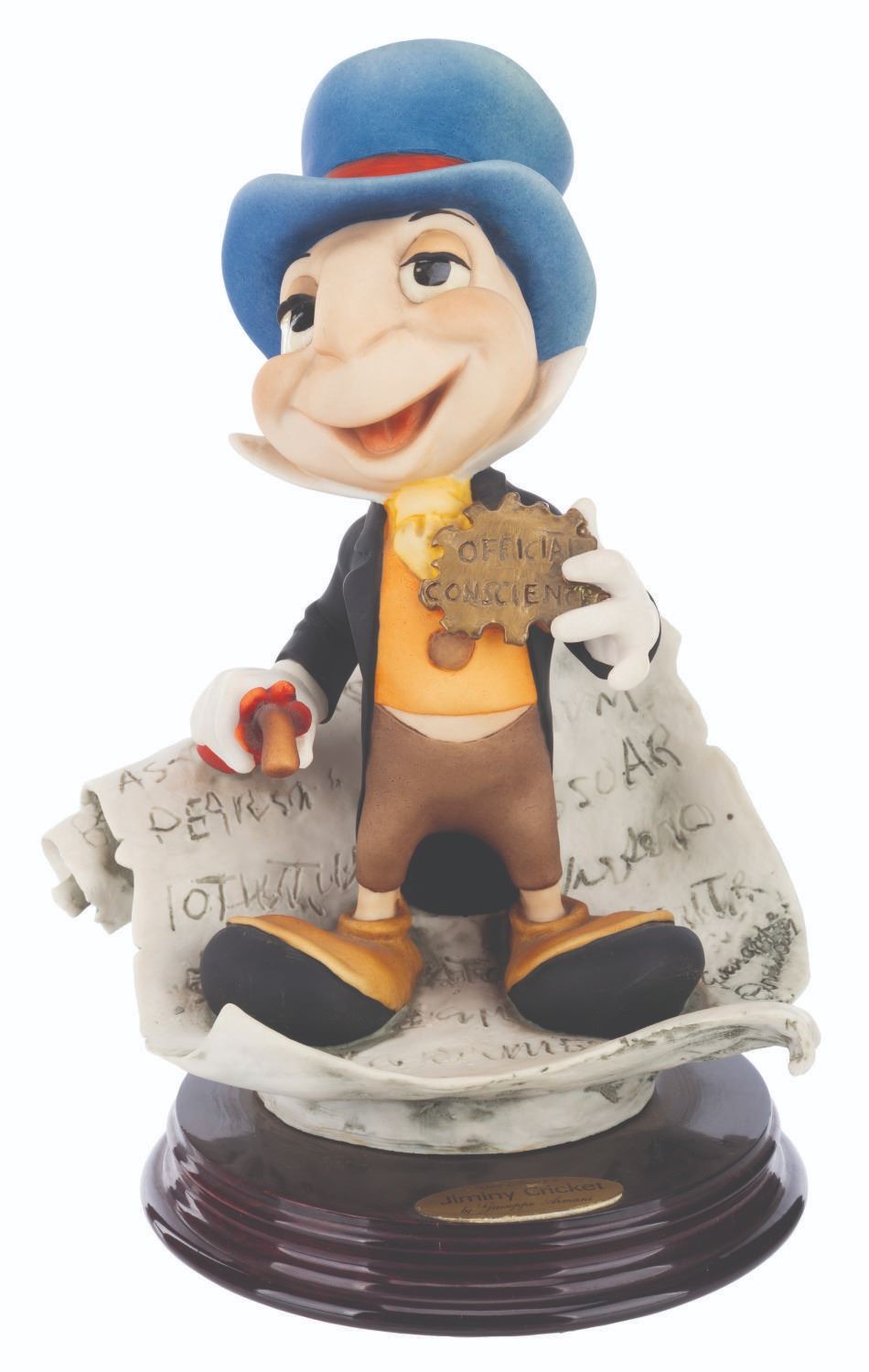 (Giuseppe Armani, 1995) A fine art sculpture of Jiminy Cricket from "Pinocchio” by Giuseppe Armani. Jiminy stands atop a wooden base proudly displaying his "Official Conscience” badge. Measuring 9” tall and 5.25” in diameter, the resin sculpture is in very good condition with light scuffs, scratches, and wear.