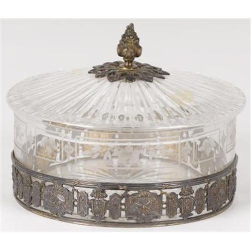 <B>A Glass Lidded Dish<BR></B></I>Unknown maker<BR>Circa 1900<BR>Etched glass dish with a metal overlay to the foot and metal floral form handle<BR>Unmarked<BR>4.5 inches high<BR><BR><b>Shipping:</b> Requires 3rd Party Shipping (<a target="_blank" href="http://www.heritageauctions.com/common/shipping.php">view shipping information</a>)