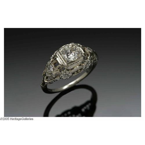 <B>A Gold And Diamond Ring</B></I><BR><BR>The 18K white gold ring with a filigree mount set with three diamonds, two small diamonds on each side of the shoulders approximately 2.37 points each, the larger center stone 64.58 points, 3.4 grams gross weight, stamped on the inside <I>18K</B></I> <BR><BR><B>Important no