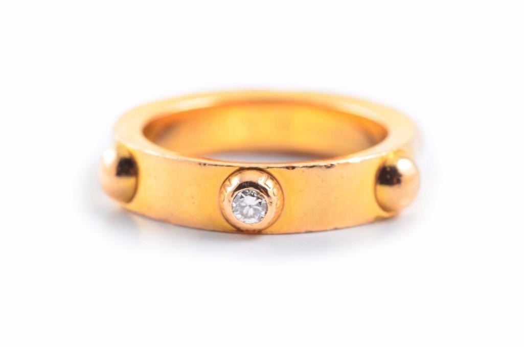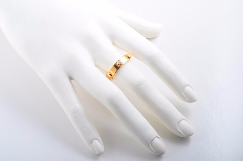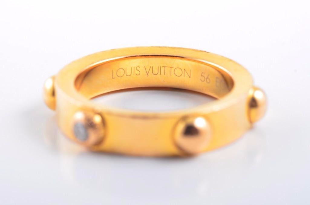 Designed as an 18K yellow gold band with 6 half-spheres protruding from the outter surface of the ring and one circular-cut diamond set in the center of the ring, weighing approximately 0.08 carats; signed Louis Vuitton 56 ECI 020 750, maker's mark; ring size 8; weight 11g.