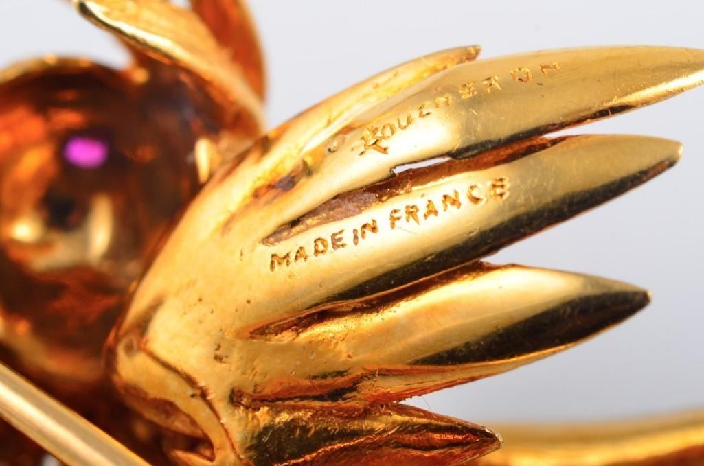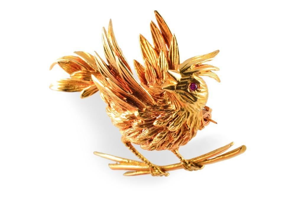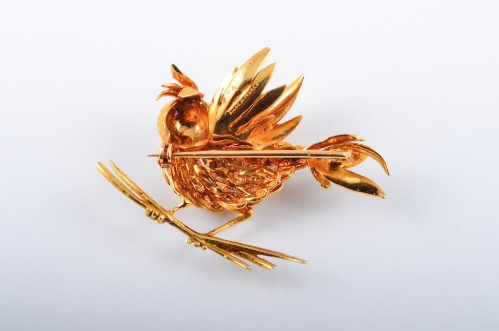 Designed as a pin in the shape of a bird with ajoyous expression; signed Boucheron Made in France 750; length 1-5/8 inches; width 1-3/8 inches; weight 19g.