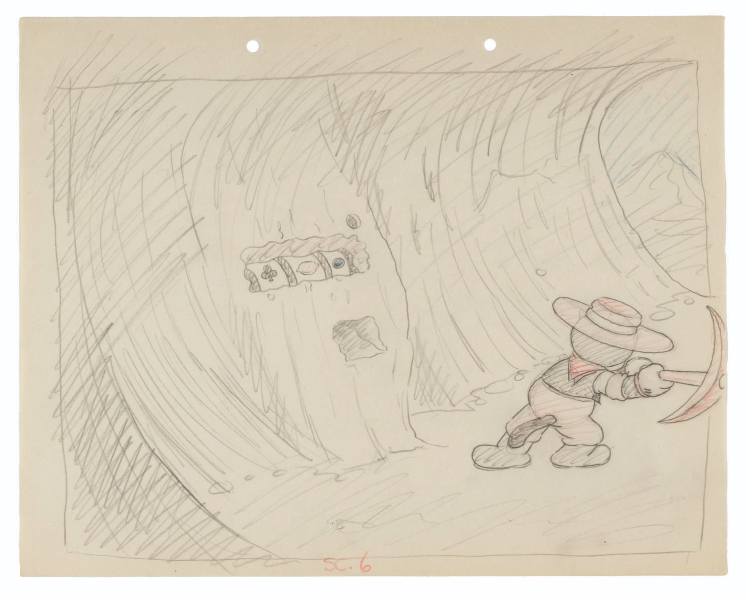(Schlesinger, 1935) An original storyboard drawing featuring Beans from the Looney Tunes Short “Gold Diggers of '49.” Accomplished in graphite and colored pencil, and measuring 9.5” x 12” the drawing is in fine production used condition with light discoloration from age.