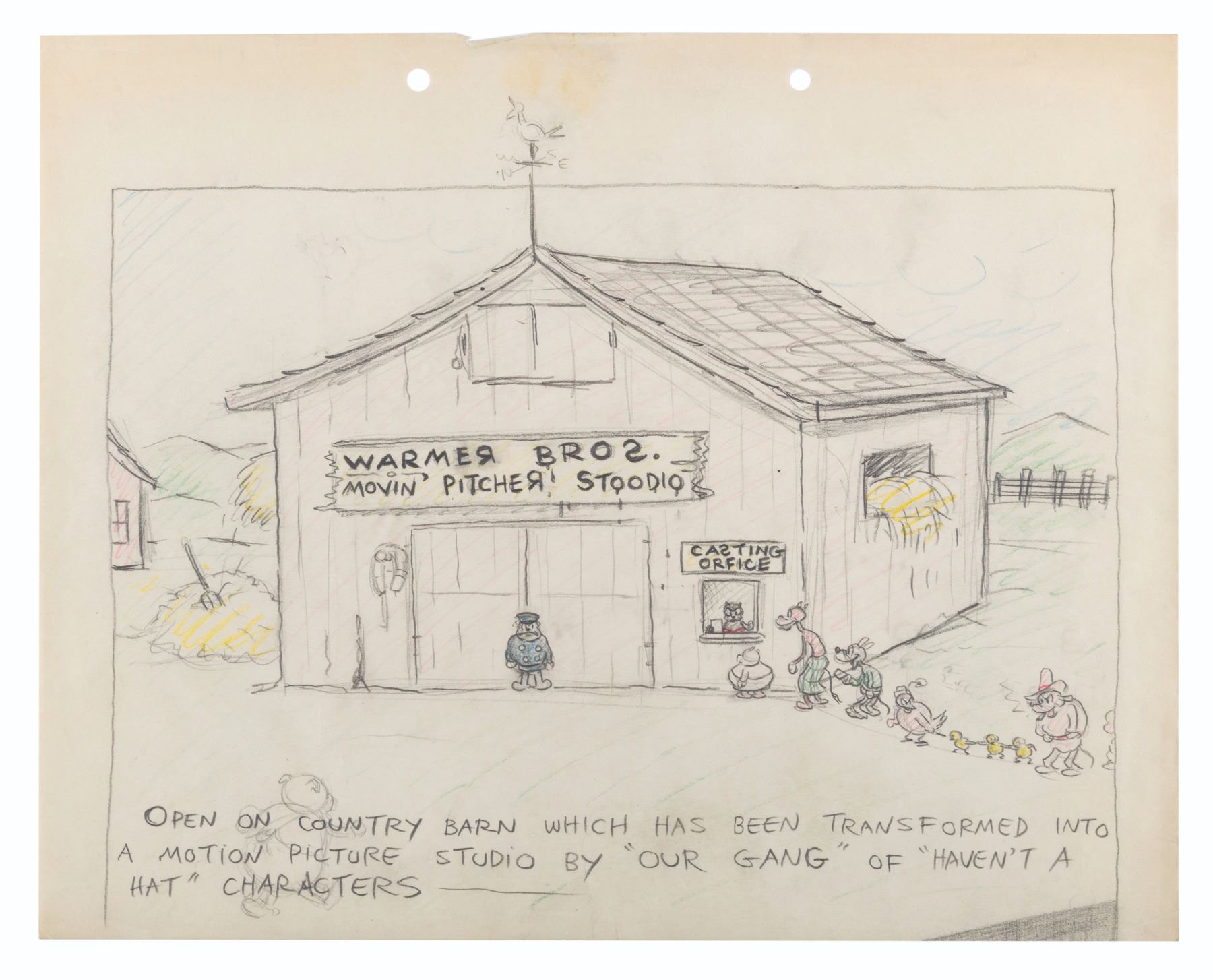 (Schlesinger, 1935) An original story drawing for a deleted opening to the Looney Tunes short “Gold Diggers of ‘49.” This was the third cartoon to feature Schlesinger’s requested ensemble cast meant as an animated answer to Hal Roach’s “Our Gang,” which the note at the bottom of this drawing reinforces. This scene would have framed the short as a film created by the kids, instead of a separate stand-alone adventure. Measuring 9.5” x 12” the drawing is in good condition with edgewear and creasing from production use and light discoloration from age.