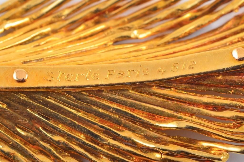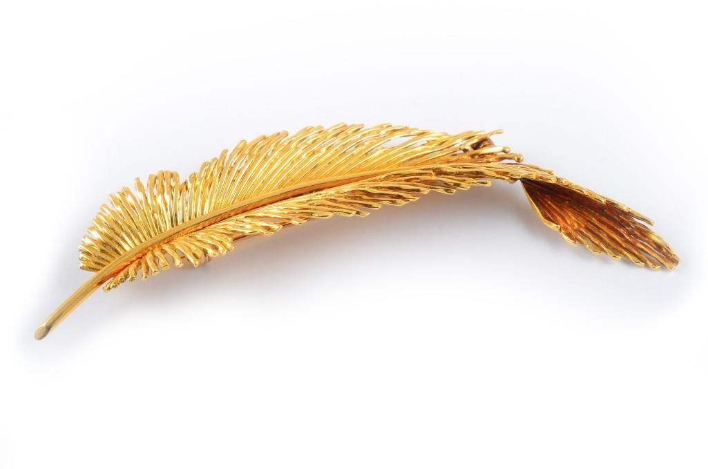 Sterle 18K gold feather pin. Signed Sterle Paris 4512. Length 3 1/4 inches, width 3/4 inches, weight 5.7g.