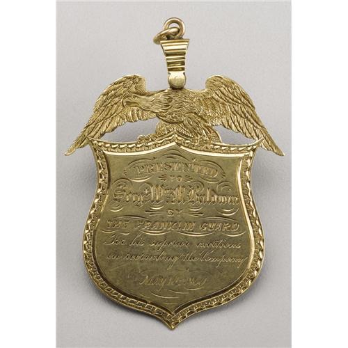 <B>A Gold Presentation Medal for Civil War Recruitment</B></I> As the Civil War seemed imminent, state militias began recruiting young men in case they were needed for service in the United States armed forces. They had no idea of how many men they would ultimately need to fight the nation's bloodiest conflict.<BR><BR>This large gold medal in the shape of a shield is a recruiting award to a Sergeant William M. Baldwin. Measuring 1½” x 2½”, it was presented to him by Major William Nary on May 10, 1860 by the 'Franklin Guard' for “his superior exertions in recruiting the company”. Engraved on both sides with jeweler's quality script the shield is surmounted by a highly intricate eagle with its wings spread. The loop at the top for a necklace to be attached is in perfect condition as is the entire pendant, obviously treasured by someone for over 160 years.<BR><BR>This is a beautiful large gold medal that is a reminder of the lead-up to the Civil War.<BR><BR> <B>Provenance:</B></I> <I>The Tharpe Collection of American Military History</B></I><BR> <BR><B>Exhibited:</B></I> <I>The Liberty Heritage Society Museum</B></I><BR><BR><b>Shipping:</b> Miscellaneous Collectibles, Smal (<a target="_blank" href="http://www.heritageauctions.com/common/shipping.php">view shipping information</a>)
