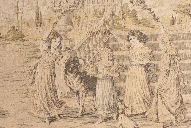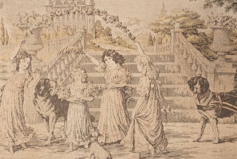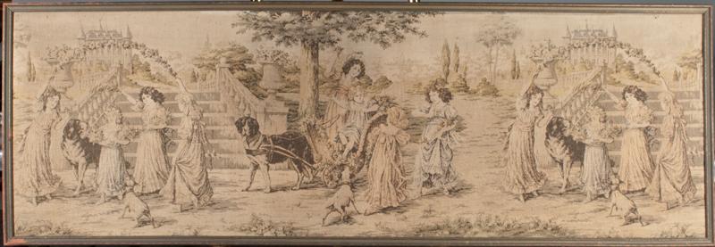 Finely sewn to depict a village scene with children and dogs, 57"W X 19.5"W, circa 1920.