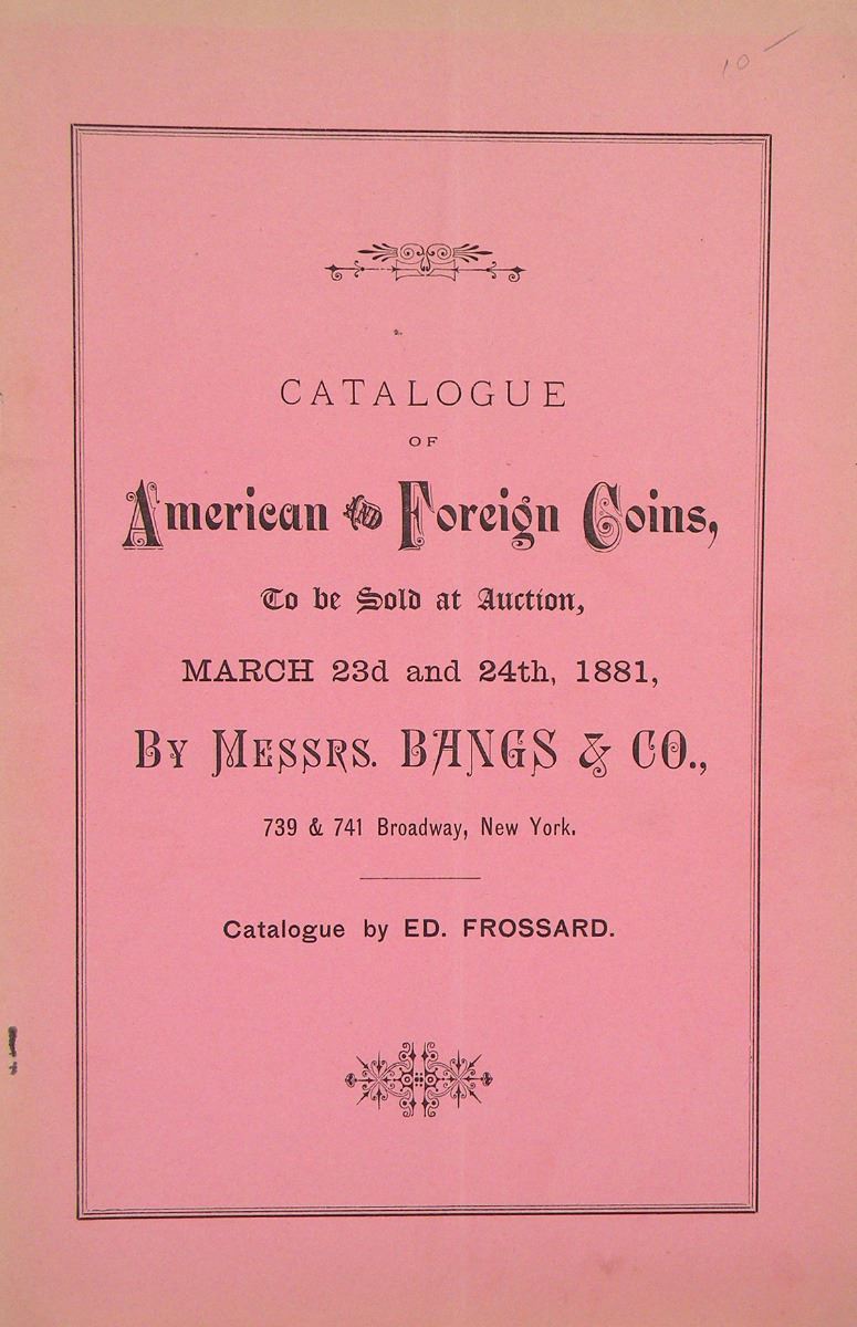 Frossard, Ed. AUCTION CATALOGUES. New York, 1878-1898. Nineteen different auction catalogues, being Adams Nos. 1, 8, 13, 14, 18, 19, 22, 25, 30, 33, 34, 51, 68, 94, 125, 134, 148, 153 and 157. 8vo, nearly all in original printed wraps or card covers. Condition varies, but generally very good to fine, with a few exceptions. A decent group of 19 Frossard auction catalogues, including some important sales. One of America’s most colorful and outspoken early coin dealers, Édouard Frossard was one of the premier American coin dealers in the last quarter of the nineteenth century. Perhaps best known for Numisma, his highly entertaining 1877-91 house organ, Frossard’s auction sales are a better testament to his distinguished numismatic career. John Adams writes: “In terms of content, the Frossard catalogues represent great variety and, cumulatively, great knowledge. Bespeaking quality, no less than twenty-one of the sales draw a rating of A- or better.” A number of key catalogues are present here, including: Frossard’s June 1883 sale of the E.F. Kuithan collection, his 1883 catalogue of the William Poillon collection (including his library), the highly important 1884 sale of Isaac F. Wood’s collection (rated A+ overall by Adams), his excellent April 1886 offering of ancient coins, W.M. Friesner’s early silver and proof coins (1894), and the “New Jersey collection” of 1898.