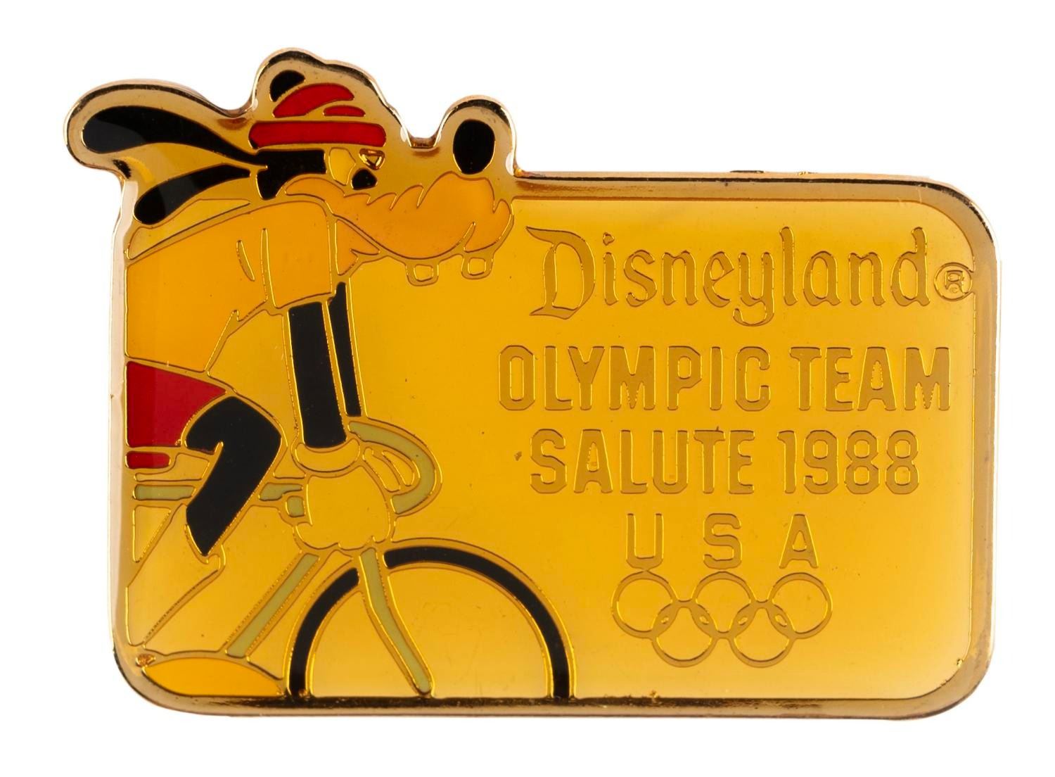 (Disneyland, 1988) A Disneyland Olympic Team Salute 1988 pin, featuring Goofy cycling. Measuring 1.5” wide, the pin is in very good condition with color shift from age.