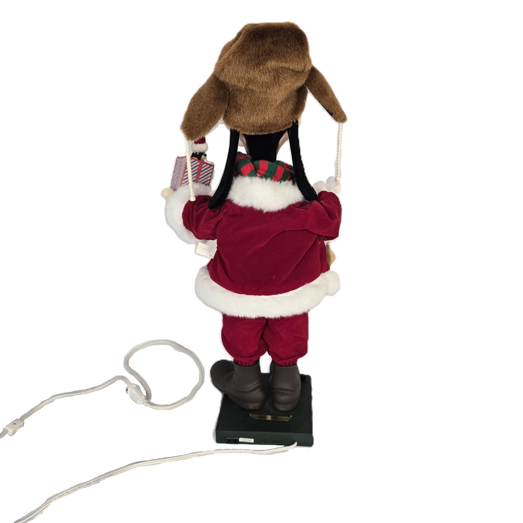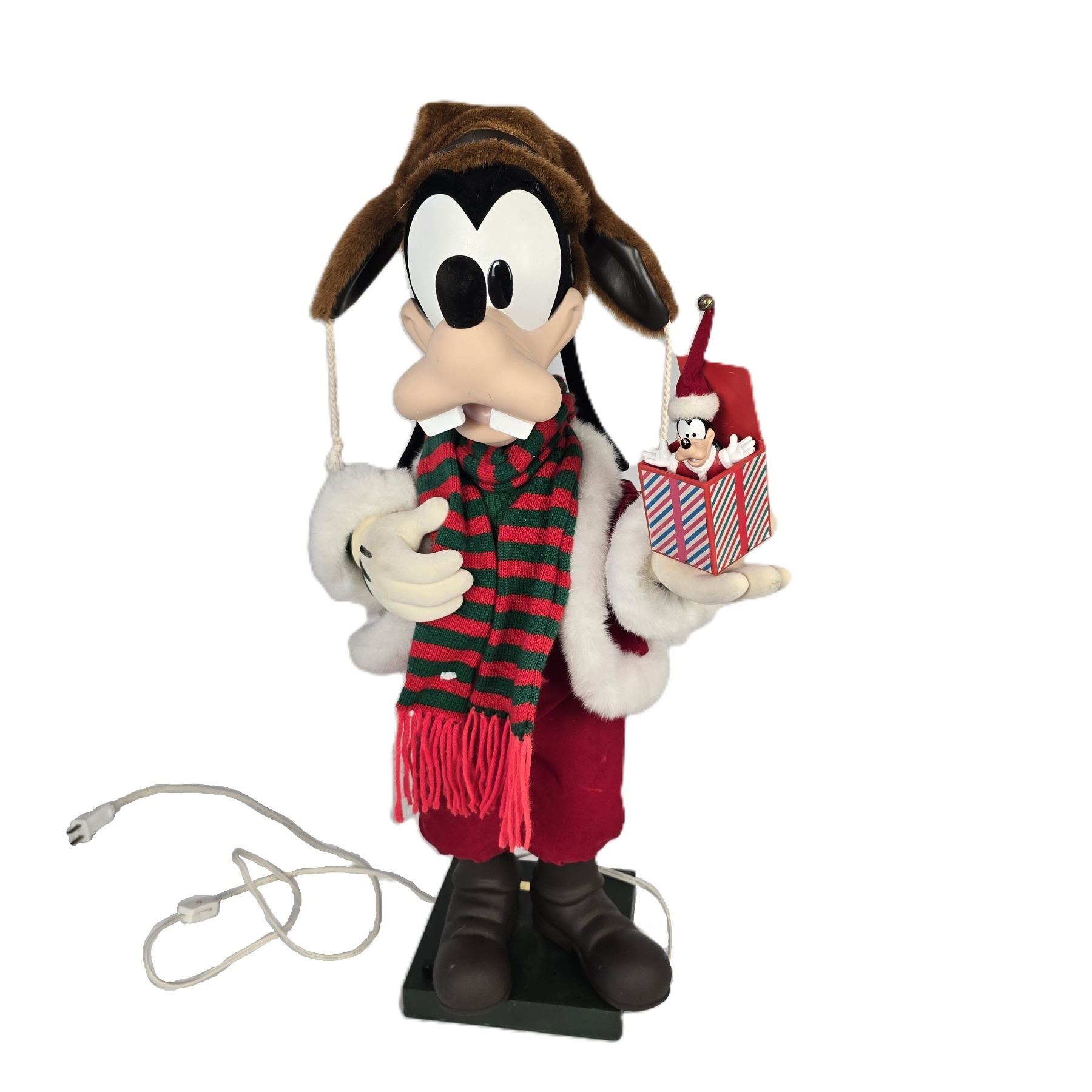 (Disney Store, 1994) This is a great condition , fully functional Goofy Christmas animatronic from the It's A Small World Holiday Series. The pose able arms move up and down, the head goes side to side and the base plays Christmas Carols. It has only a few minor flaws including the Goofy-in-a-box nose has a little rubbing and the lid holder has one broken tine. You can also chain like powered items together via a power output on the back. It measures 10.5” x 12.5” x 29.5” and weighs 8 lbs.
