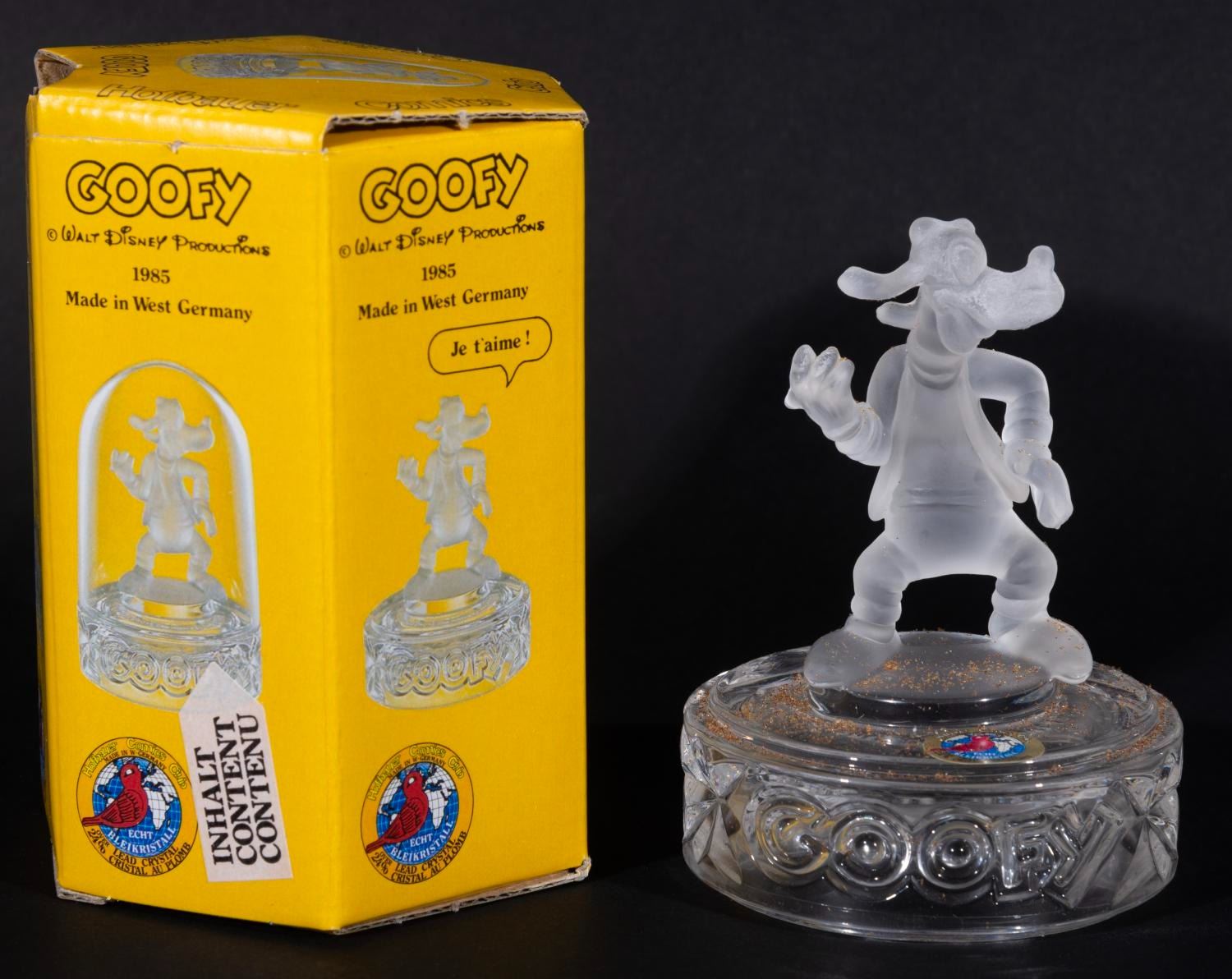 (Hofbauer, 1985) A Hofbauer Comics Club crystal figurine of Goofy. Measuring 2.75" x 4.5", the 24% lead crystal figurine is in good condition with light soiling, missing its crystal display dome, but in its original, hexagonal box.