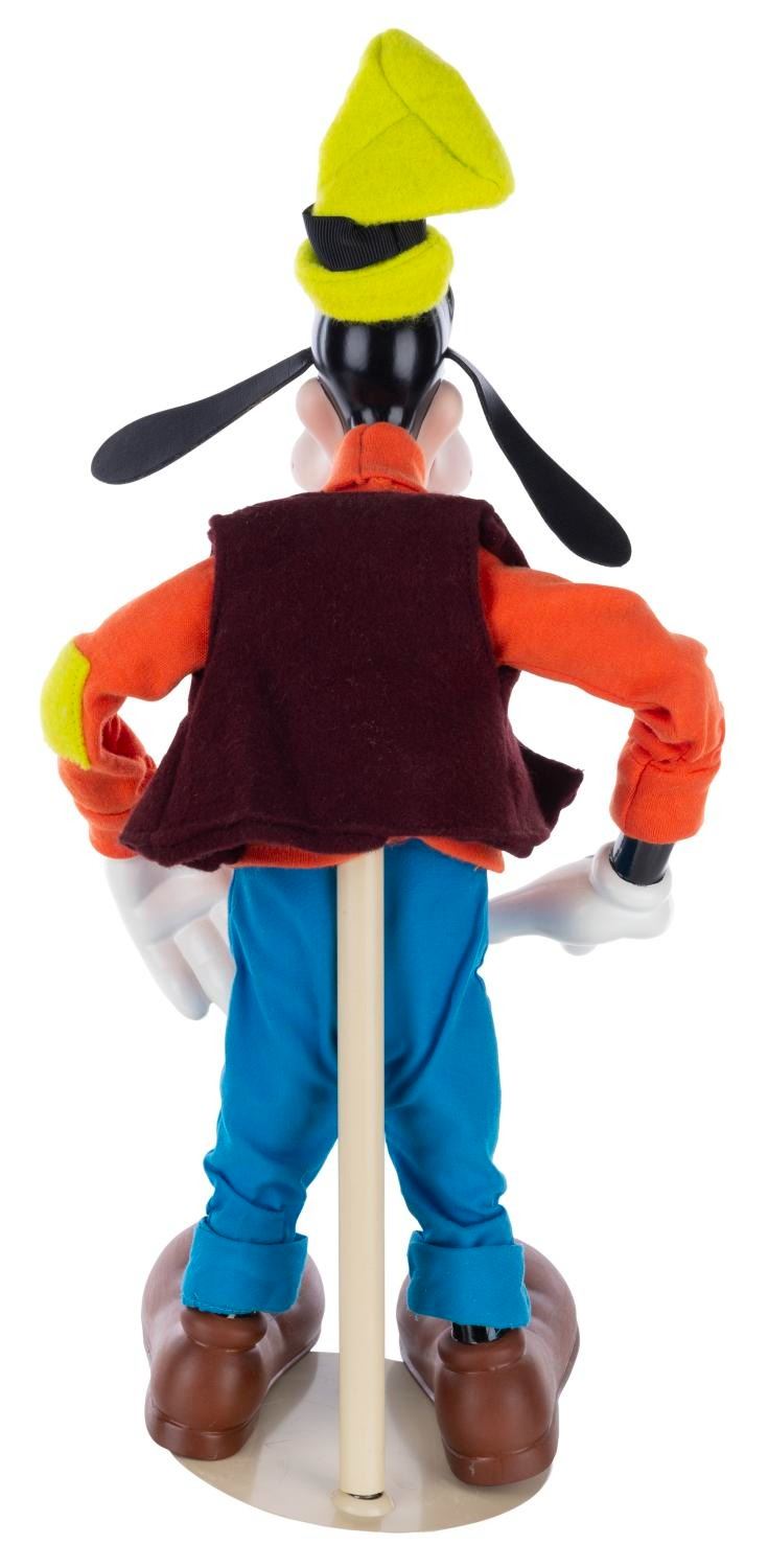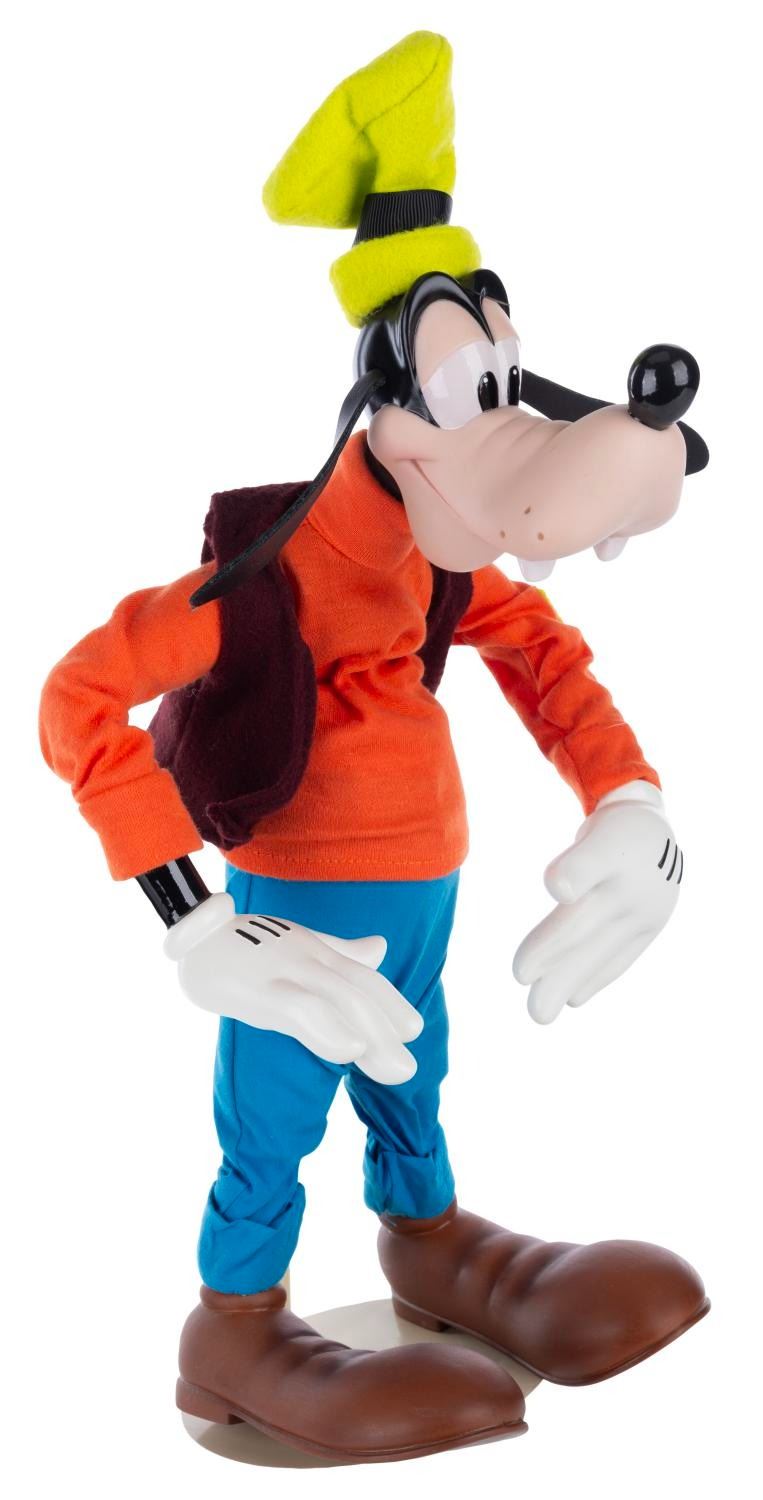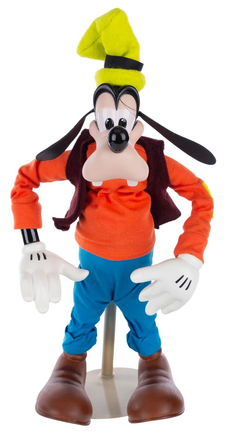 (Franklin Mint, 1990s) A Premier Edition hand-painted porcelain Goofy doll featuring poseable arms and vibrant fabric clothing. The meticulously detailed doll comes with the original packaging and display stand. Measuring 16" in length, the doll is in fine condition. The box measures 8.5" x 7.5" and 19" in length and is in good condition with wear and discoloration from use and age.