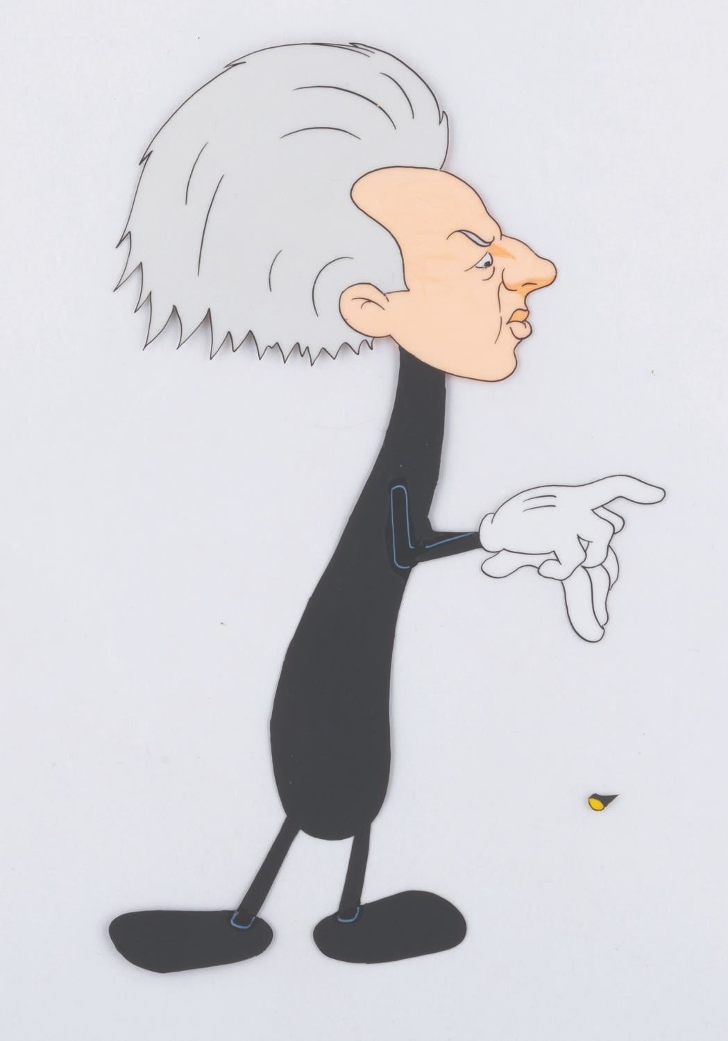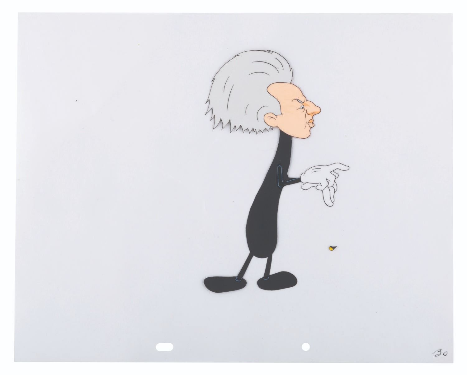 (Schlesinger, 1941) An original hand-painted production cel of Leopold Stokowski from “Goofy Groceries.” The caricature of the famed “Fantasia” composer comes to life from a dish mop in this Merrie Melodies film directed by Bob Clampett. With an image size of 4” x 7” on a 10” x 12.5” cel, the piece is in good condition with spots of paint loss, scratches, and light wear.