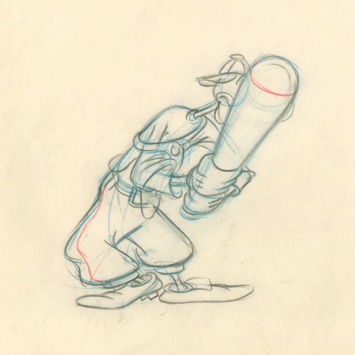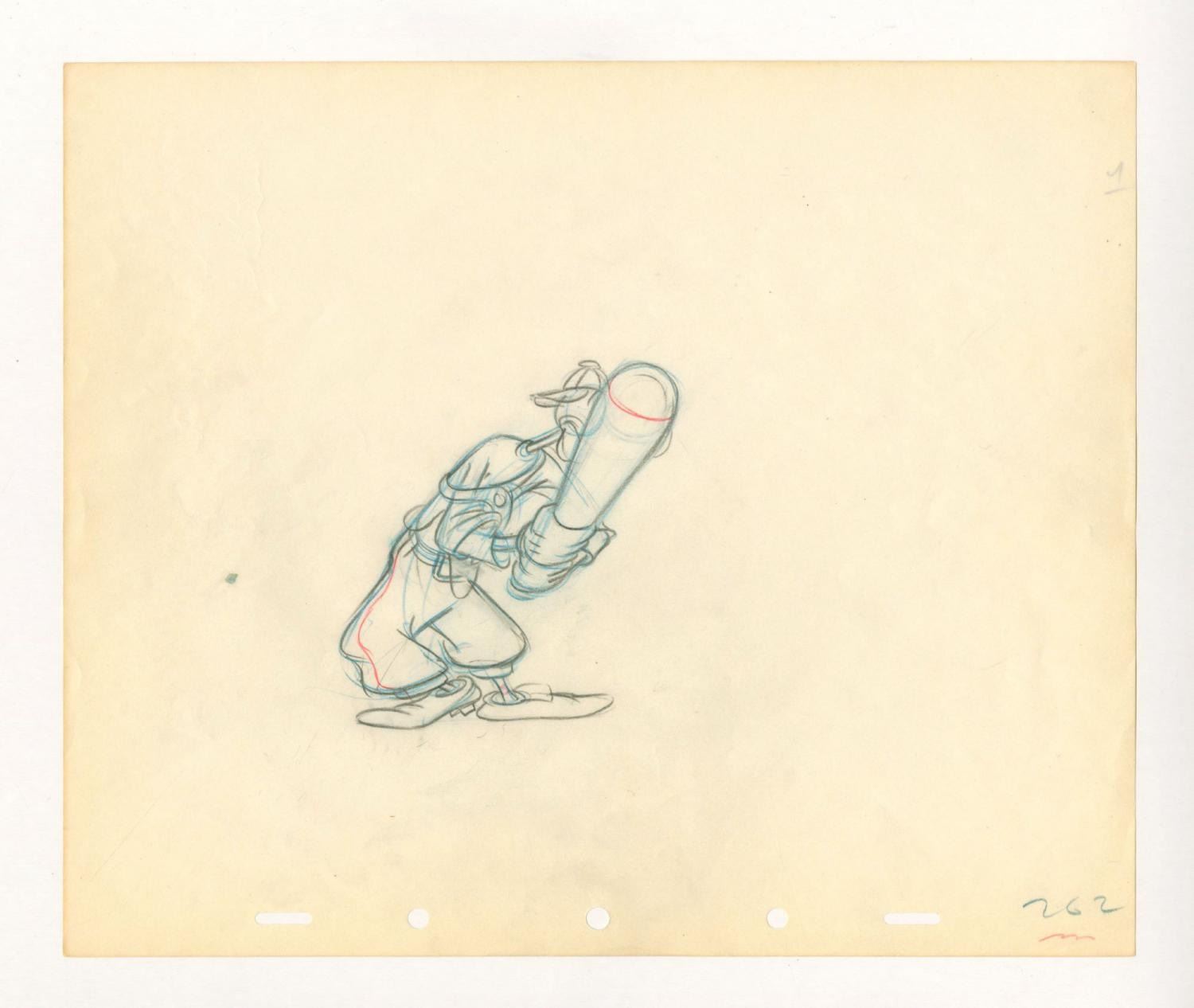 (Disney, 1942) A graphite and color pencil production drawing of Goofy from the short "How to Play Baseball." With a character image size of 4" x 4" on 10" x 12" animation paper, the drawing is in very good condition with light discoloration, particularly to the edges, and a small spot to the left of Goofy.