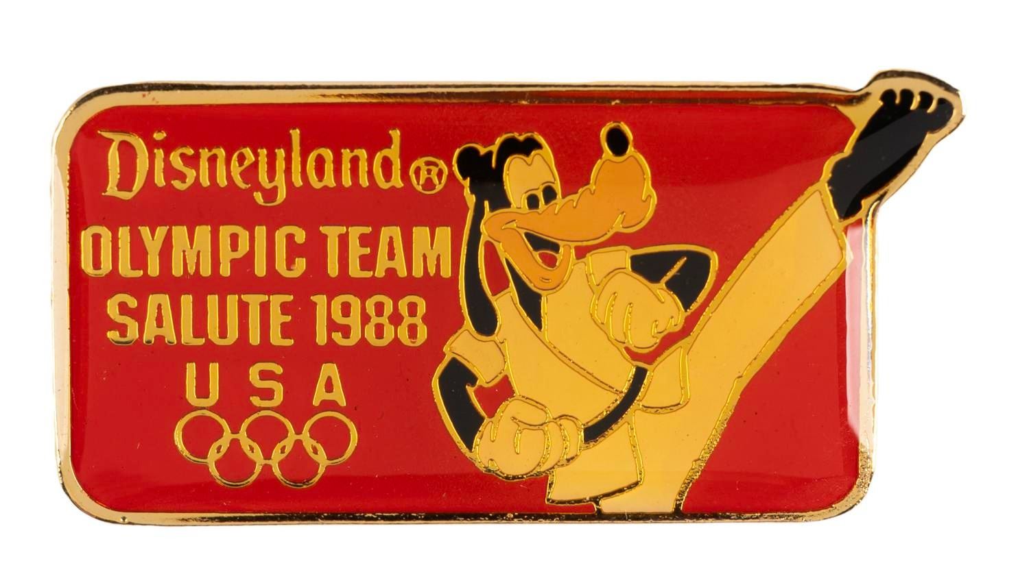 (Disneyland, 1988) A Disneyland Olympic Team Salute 1988 pin, featuring Goofy performing martial arts. Measuring 1.5" wide, the pin is in very good condition with typical color shift from age.