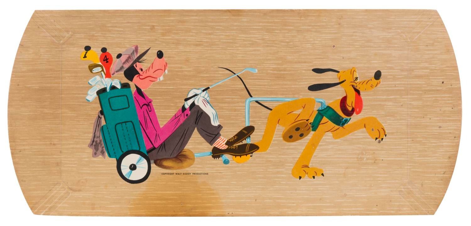 (Hasko Trays Inc. 1950s) A genuine Hasko Tray featuring Pluto caddying for Goofy. Measuring 8" x 16.5", the tray displays in fair condition with stains, spotting, and a large liquid stain on the back.