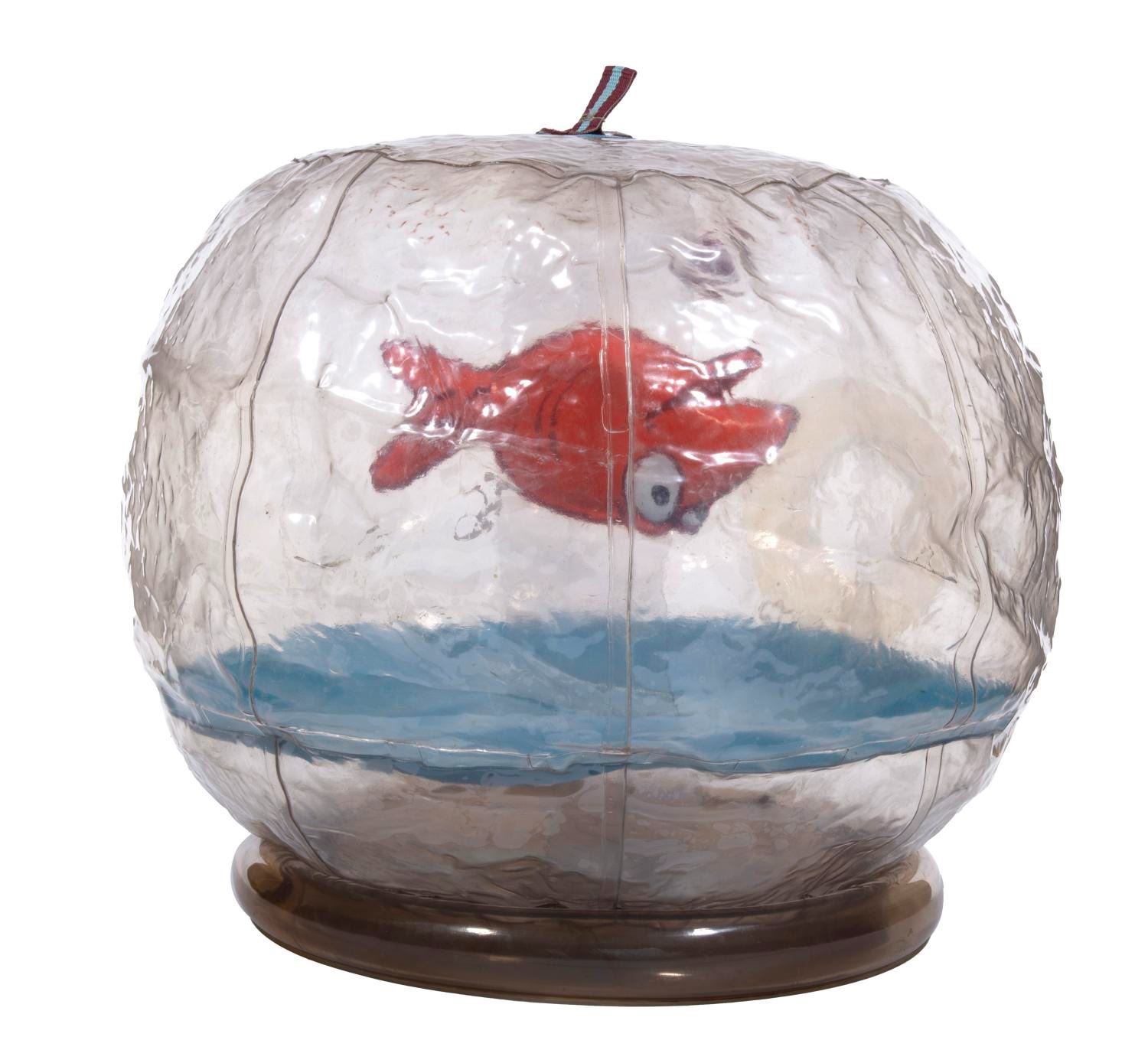 (Disneyland, 1990s-2022) A large, inflatable, fishbowl prop from Goofy's Bounce House in Mickey's Toontown at Disneyland. Measuring 22" at its widest diameter and 16.5" tall, the prop is in good condition, despite some wear and yellowing to outer vinyl from age.