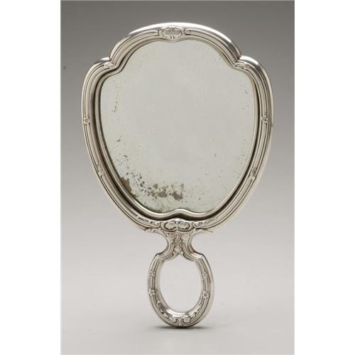 <B>An American Silver Hand Mirror</B></I><BR><B>Gorham, Providence, RI, Early Twentieth Century</B></I><BR><BR>Script monogram to the reverse <I>AFS,</B></I> hallmark to the side with <I>STERLING C943</B></I><BR>8.2in. long x 5.2in. wide1 Items <BR><BR><B>Condition Report:</B> Normal signs of wear as appropriate with age; slight degredation to the silver backing on the glass. <BR><BR><B>Important notice:<