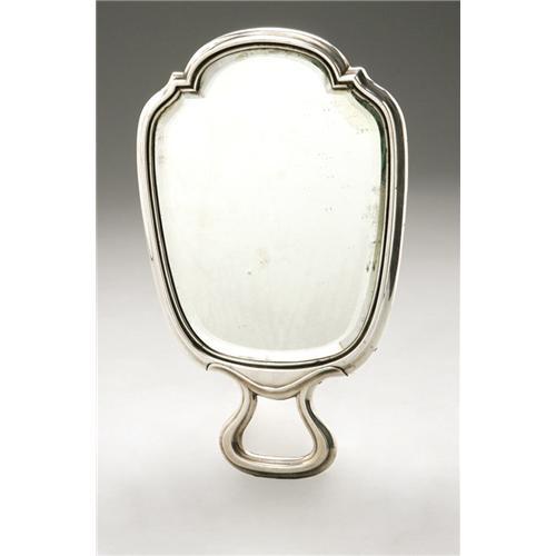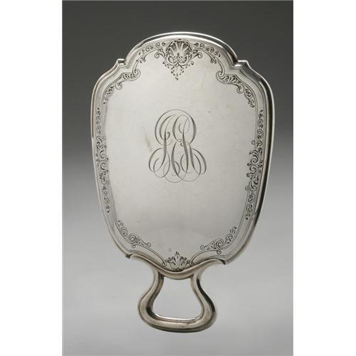 <B>An American Silver Hand Mirror</B></I><BR><B>Gorham, Providence, RI, 1920</B></I><BR><BR>Monogram to the reverse <I>JER,</B></I> hallmark to the side with <I>STERLING 2/45 3C 'spoon'</B></I><BR>7.8in. long x 5.1in. wide <BR><BR><B>Important notice:<