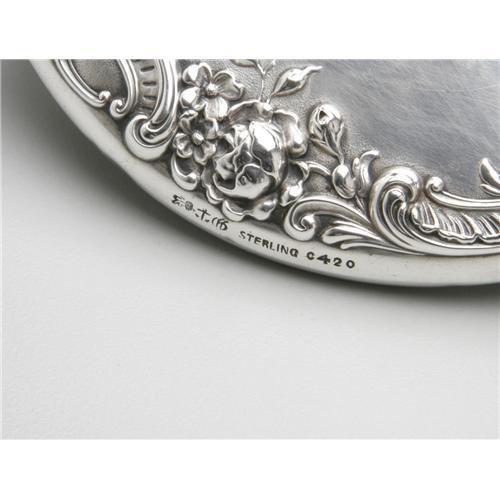 <B>An American Silver Hand Mirror</B></I><BR><B>Gorham, Providence, RI, Late Nineteenth Century</B></I><BR><BR>Hallmark on the side with <I>STERLING C420</B></I><BR>8.7in. long x 4.7in. wide <BR><BR><B>Important notice:<