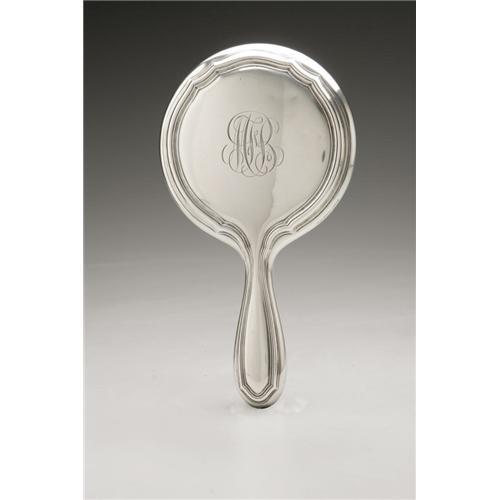 <B>An American Silver Hand Mirror</B></I><BR><B>Gorham, Providence, RI, Early Twentieth Century</B></I><BR><BR>Script monogram to the reverse <I>MFB,</B></I> hallmark to the side with <I>STERLING C2414</B></I><BR>9.5in. long x 5.2in. wide <BR><BR><B>Important notice:<