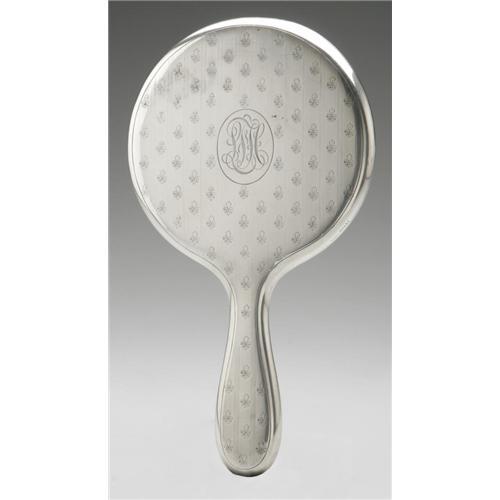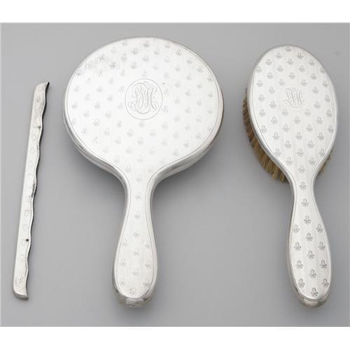 <B>An American Silver Vanity Set</B></I><BR><B>Gorham, Providence, RI, Early Twentieth Century</B></I><BR><BR>Comprising a hand mirror, hair brush and comb back, script monogram to the reverse <I>LFH,</B></I> hallmark to the side with <I>STERLING C2614</B></I><BR>The mirror: 9.5in. long x 5.3in. wide3 Items <BR><BR><B>Condition Report:</B> Normal signs of wear as appropriate with age; dent to the bottom of the handle. <BR><BR><B>Important notice: