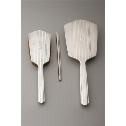 <B>An American Silver Vanity Set</B></I><BR><B>Gorham, Providence, RI, Early Twentieth Century</B></I><BR><BR>Comprising a hand mirror, hair brush and a comb back, block monogram to the reverse <I>BMC,</B></I> marked on the side <I>GORHAM STERLING B7- 2</B></I><BR>The mirror: 12in. long x 4.5in. wide <BR><BR><B>Important notice: