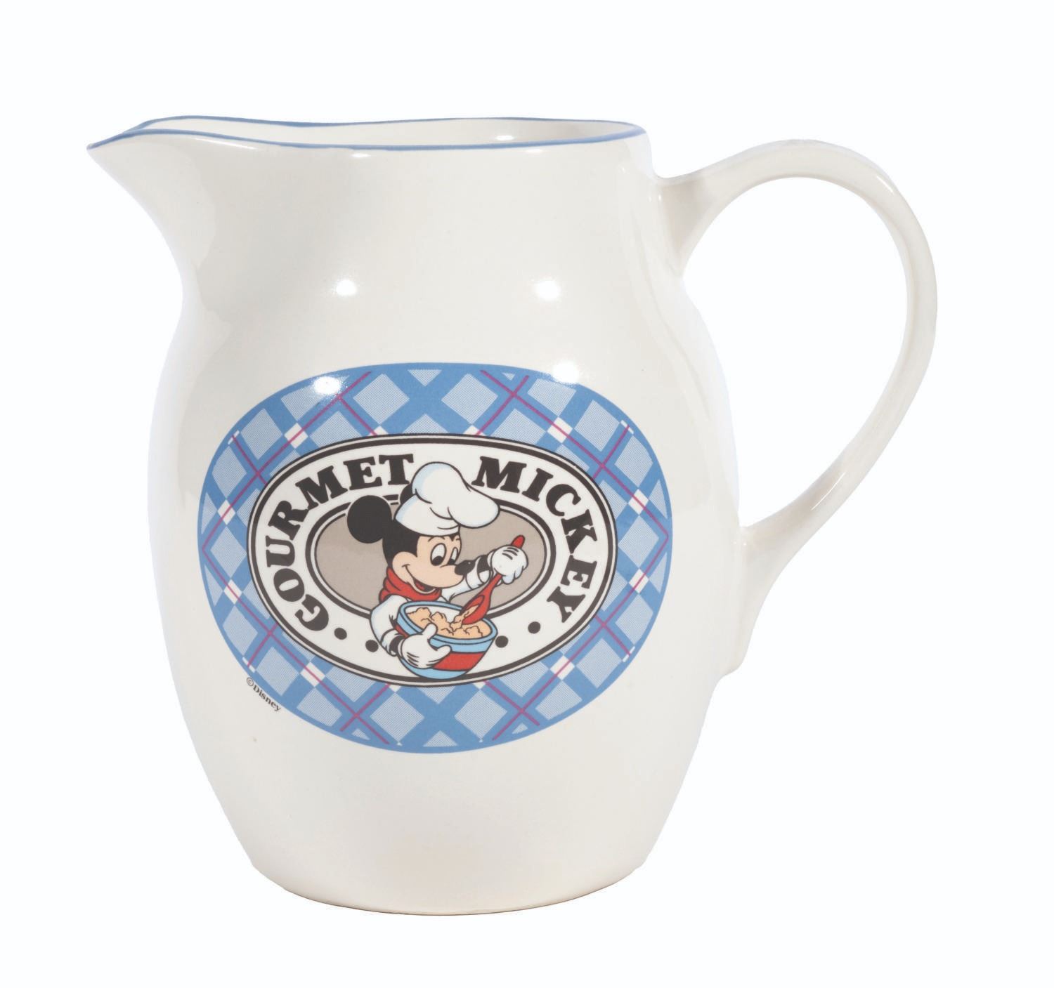 (Treasure Craft, 1990s) A ceramic Gourmet Mickey pitcher. Measuring 9.25" x 6" x 8" high, the pitcher is in very good condition with a .5" chip in the glaze at the lip of the spout.