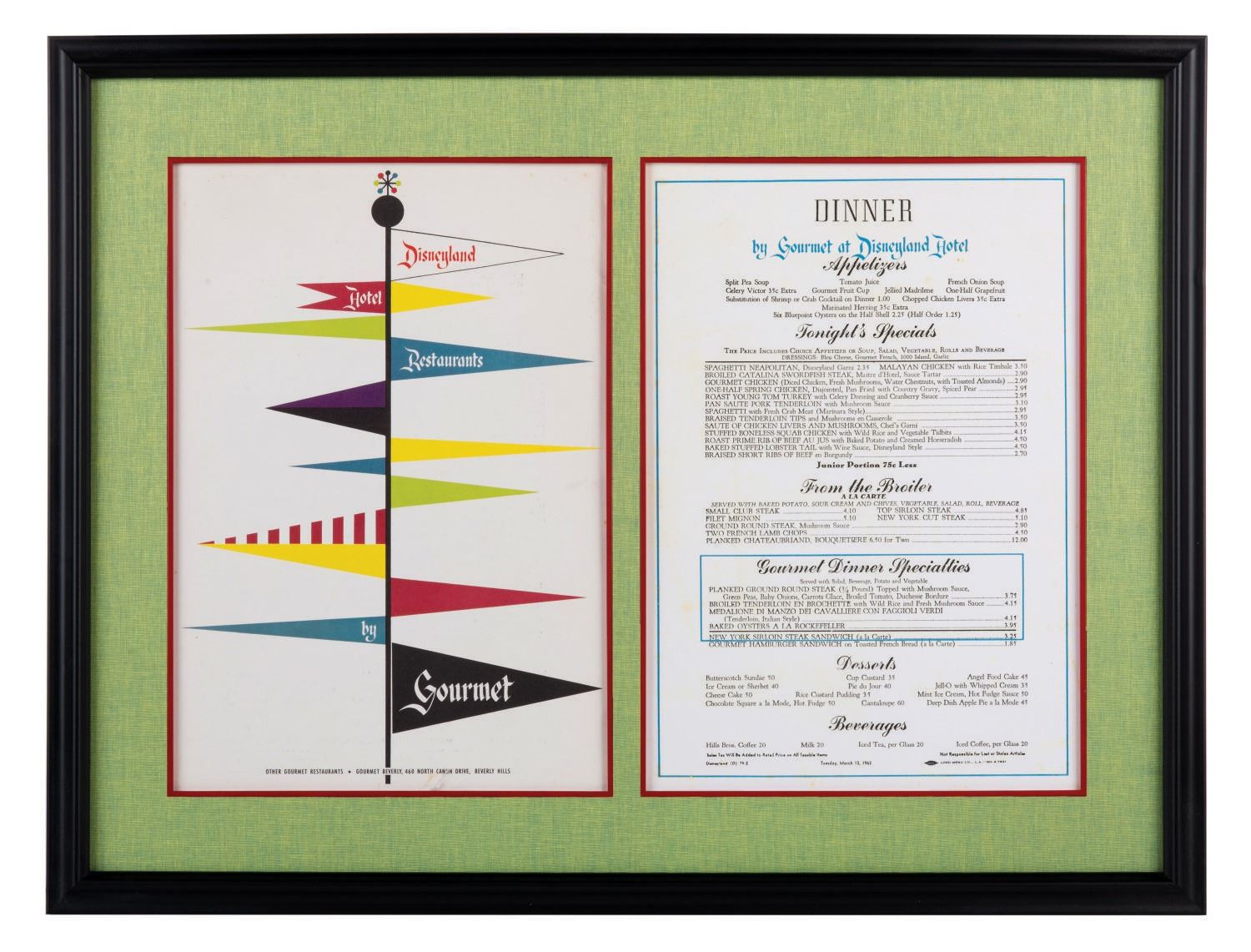 (Disneyland Hotel, 1962) A dinner menu from Gourmet Restaurants at the Disneyland Hotel. The 10.5"x15" menu has been matted within a 21.5"x27" frame and is in very good condition, despite minor stains from use and slight fading from age.