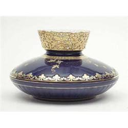 A Grainger & Co Worcester vase of compressed spherical form, gilded pierced floral neck and floral gilt decoration on a dark blue ground, patt no.G703, diameter 7ins £400-600