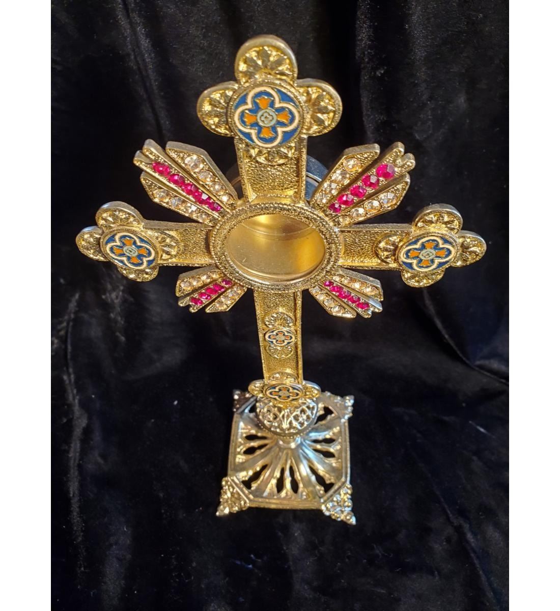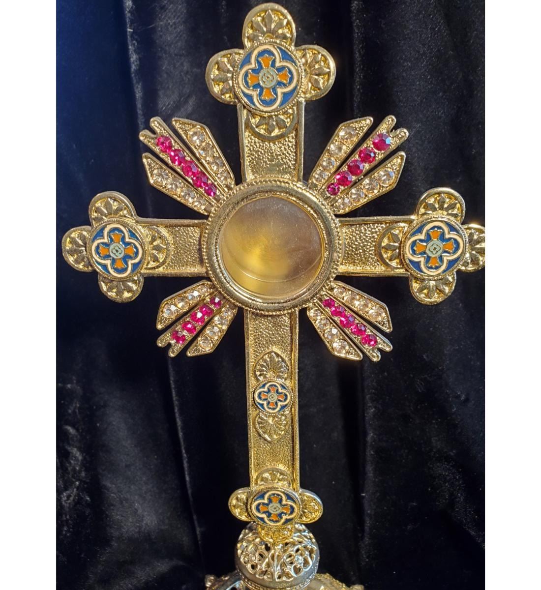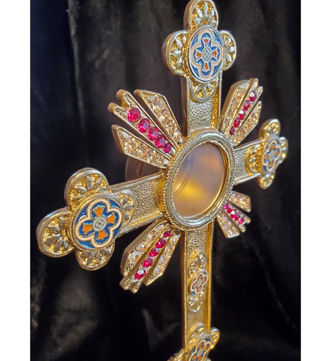 A grand enameled and encrusted jeweled reliquary. This magnificent reliquary stands 11" tall with a housing chamber of 1 3/4" to house most all thecas. Gleaming gold plate with loads of clear and scarlet jewels surround the viewing chamber as well as 4 enameled plaques. Just a superb reliquary to display your precious relic in. All relics are guaranteed to be authentic and come from a 50 year old collection. A wonderful catholic religious treasure. Relics today from Rome are impossible to acquire unless you are a priest and have your Bishops permission. They are becoming so very scarce and soon unobtainable for future devotees.