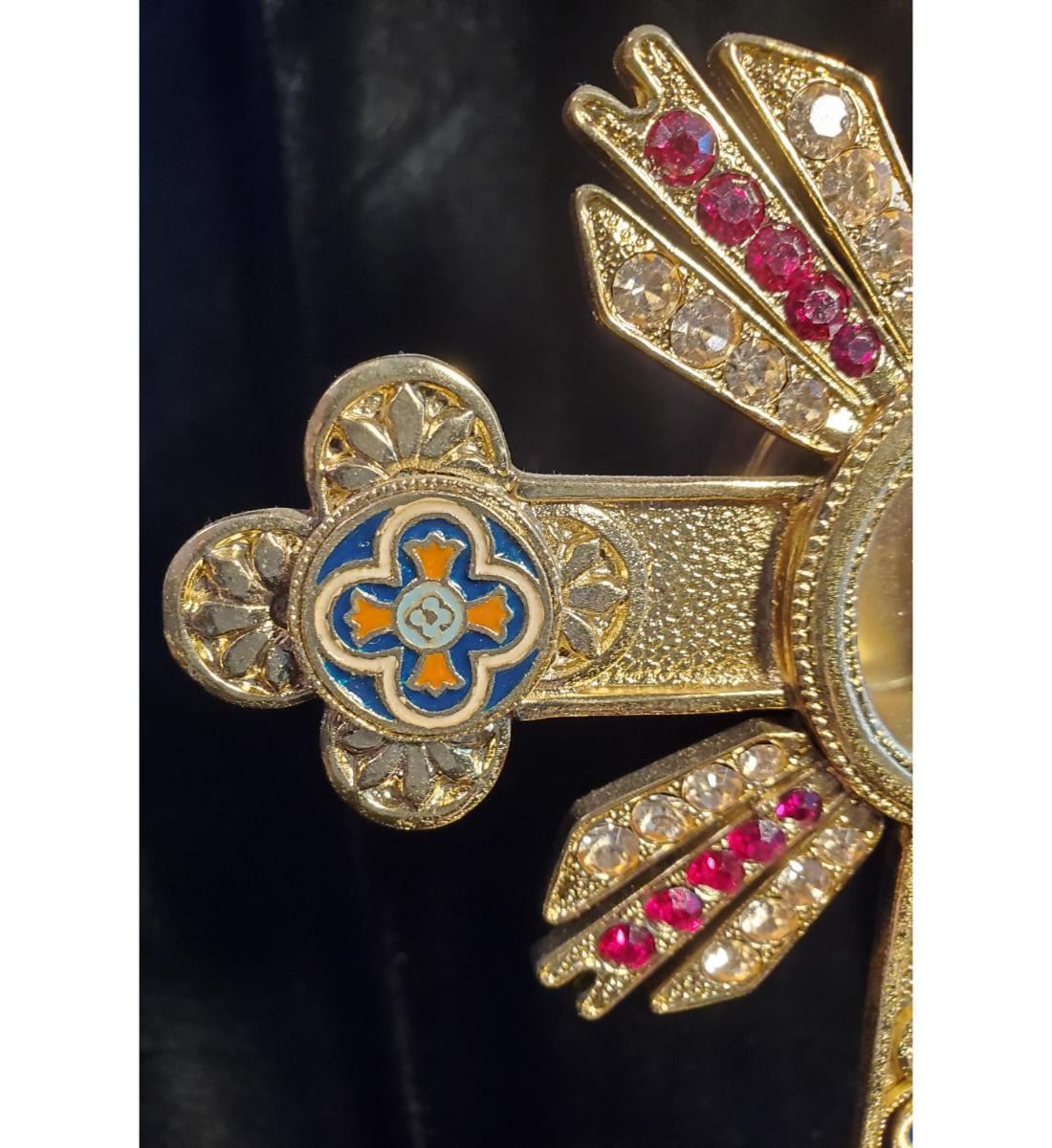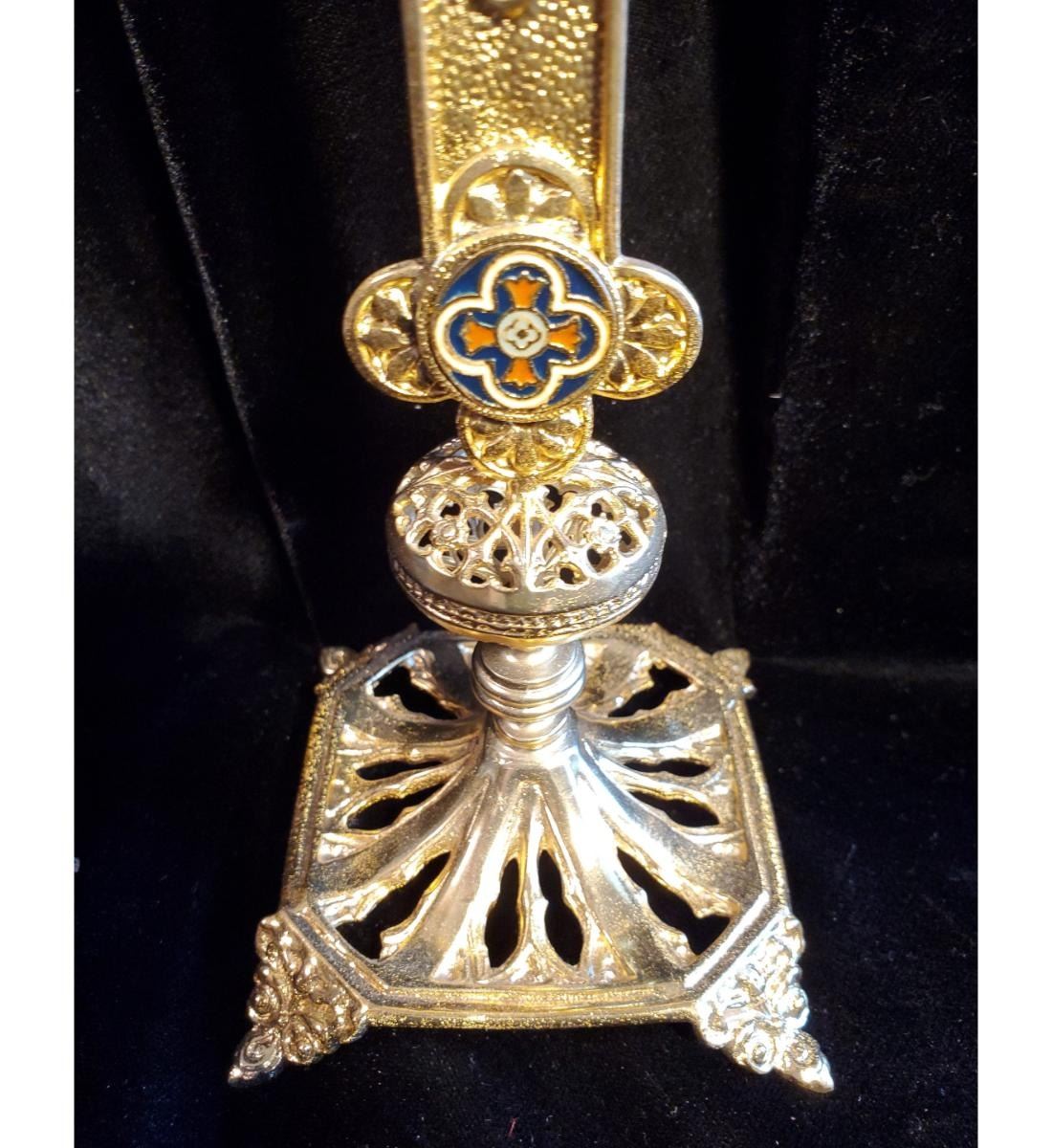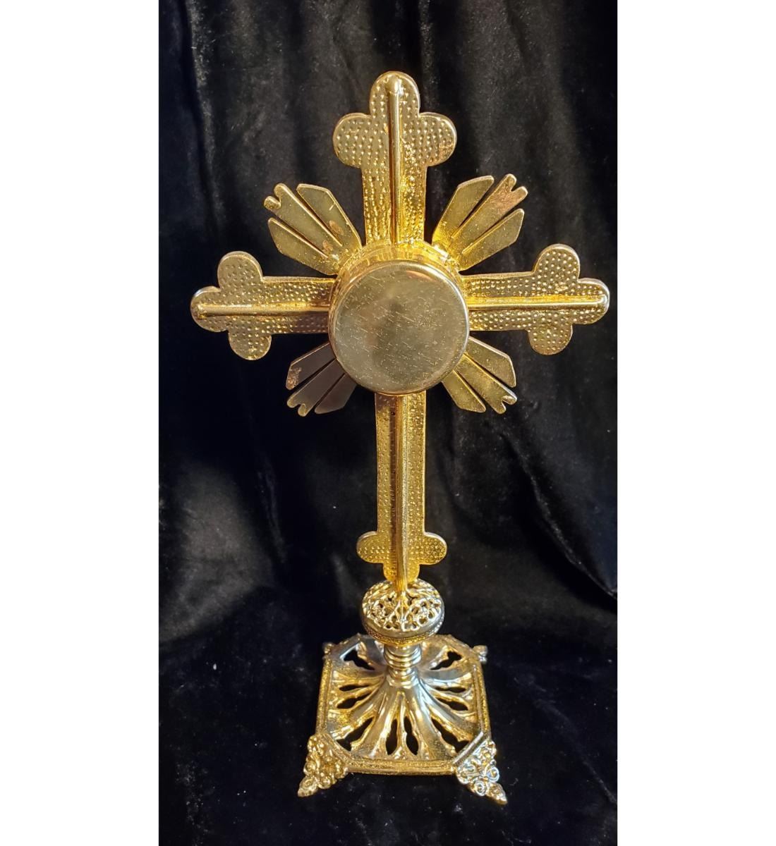 A grand enameled and encrusted jeweled reliquary. This magnificent reliquary stands 11" tall with a housing chamber of 1 3/4" to house most all thecas. Gleaming gold plate with loads of clear and scarlet jewels surround the viewing chamber as well as 4 enameled plaques. Just a superb reliquary to display your precious relic in. All relics are guaranteed to be authentic and come from a 50 year old collection. A wonderful catholic religious treasure. Relics today from Rome are impossible to acquire unless you are a priest and have your Bishops permission. They are becoming so very scarce and soon unobtainable for future devotees.
