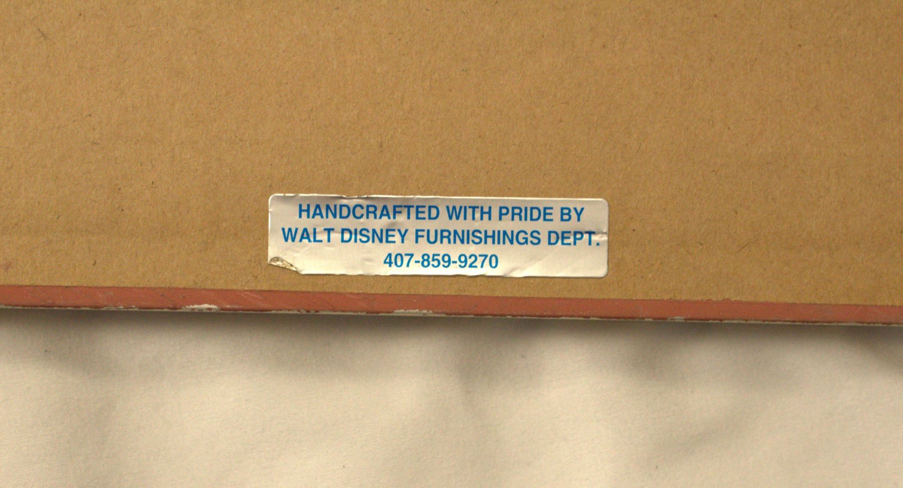 The image of the print is of Narcoossee's Restaurant at the Grand Floridian Resort and the Polynesian Resort can be seen in the background. The frame and matte have wear and spotting. The print bears the title Verandah Cove Beach Resort and overall appears lightly faded from years of display. The back retains a sticker that states "Handcrafted with Pride by Walt Disney Furnishings Department". Measures 31 1/2" x 26 1/2".
