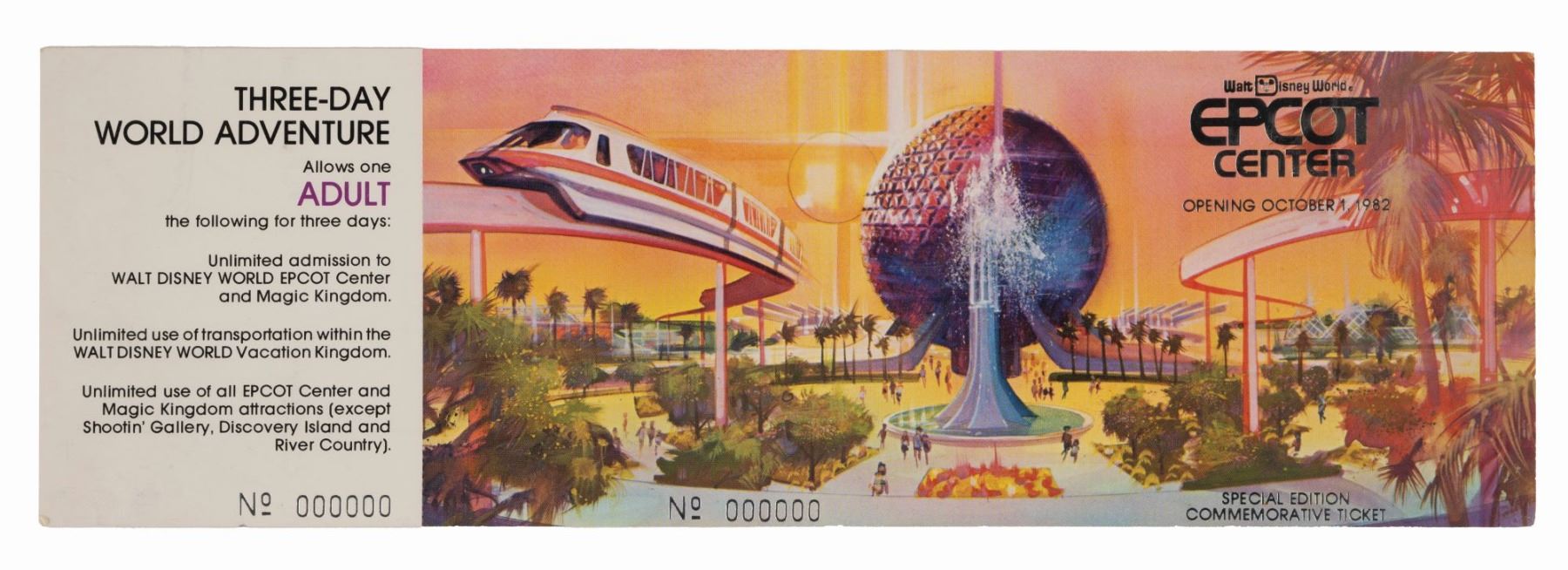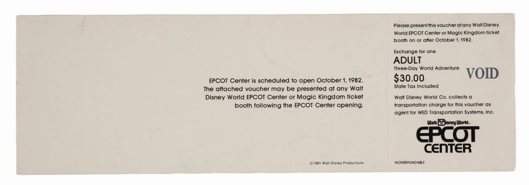 (EPCOT, 1981) A special edition commemorative ticket for the Grand Opening of EPCOT. Tickets like these allowed one adult unlimited access to EPCOT and the Magic Kingdom, unlimited use of transportation and all attractions except the Shootin’ Gallery, Discovery Island, and River Country. The back includes information about EPCOT’s opening and how to exchange the stub for a ticket. This numbered "0000" ticket is stamped VOID and was never circulated. Measuring 3.75” x 11.75”, the passport is in good condition with scratches, scuffs, and wear.