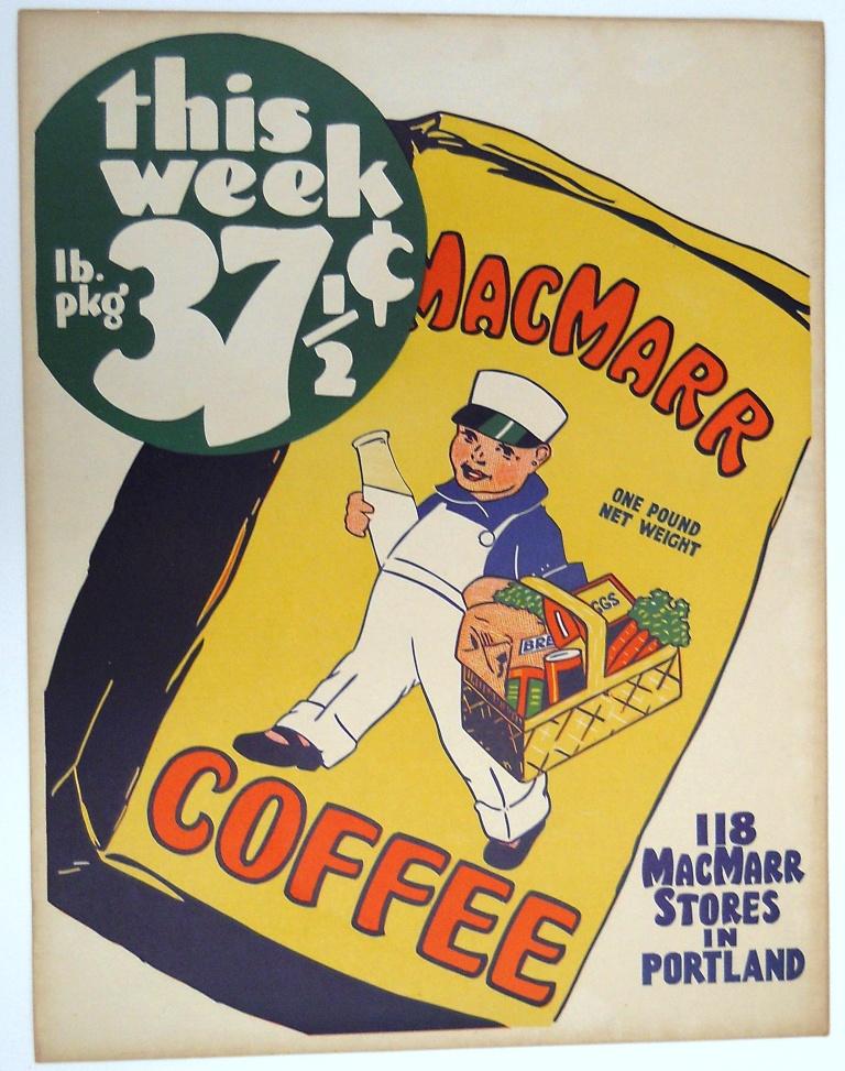 This is an old cardboard sign for MacMarr stores, featuring their coffee. In the research we did, we found this chain later became the Safeway Stores of today. The sign is 20-3/4 inches wide x 26-3/4 inches tall and is in excellent, unused condition. Great Graphics!!!