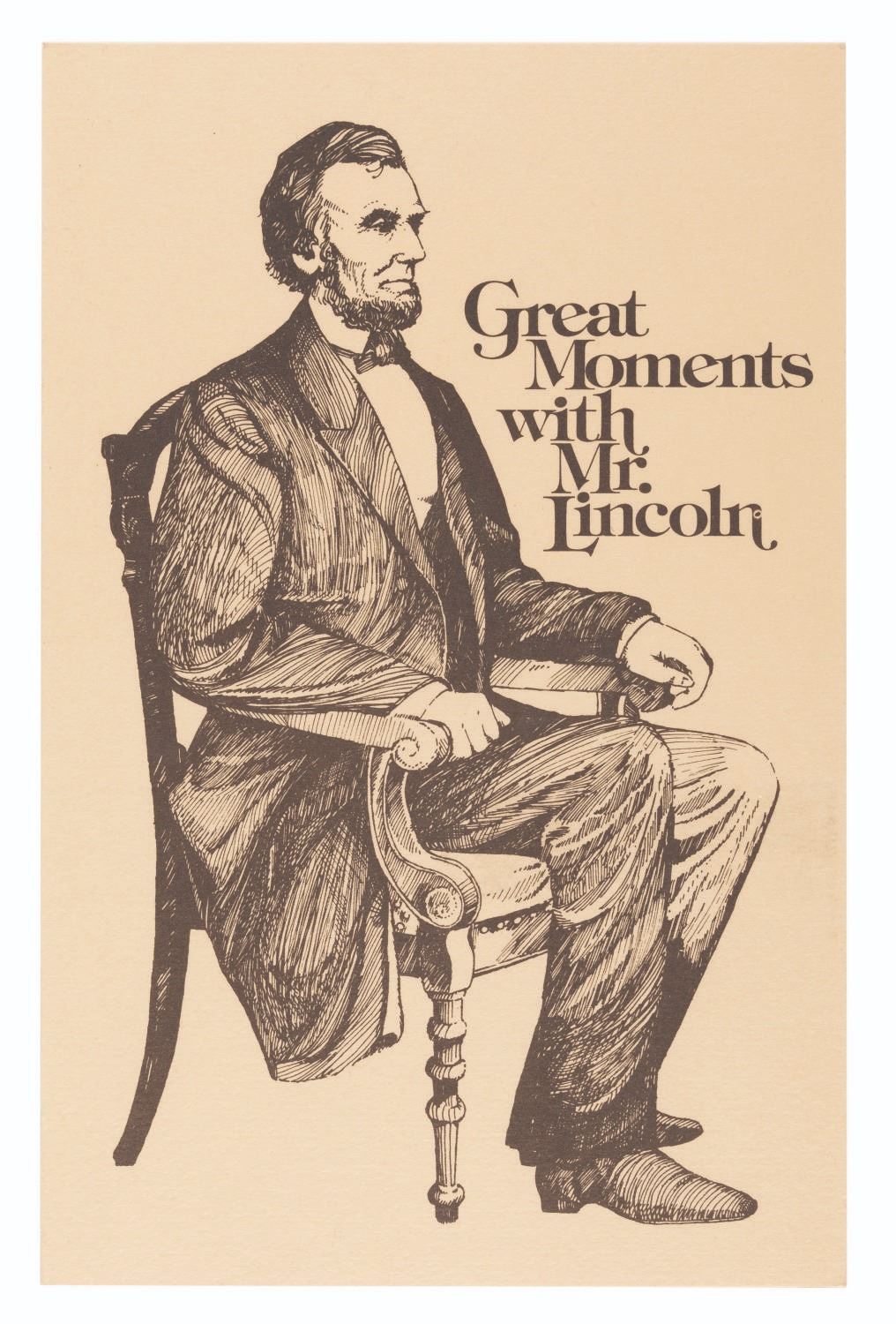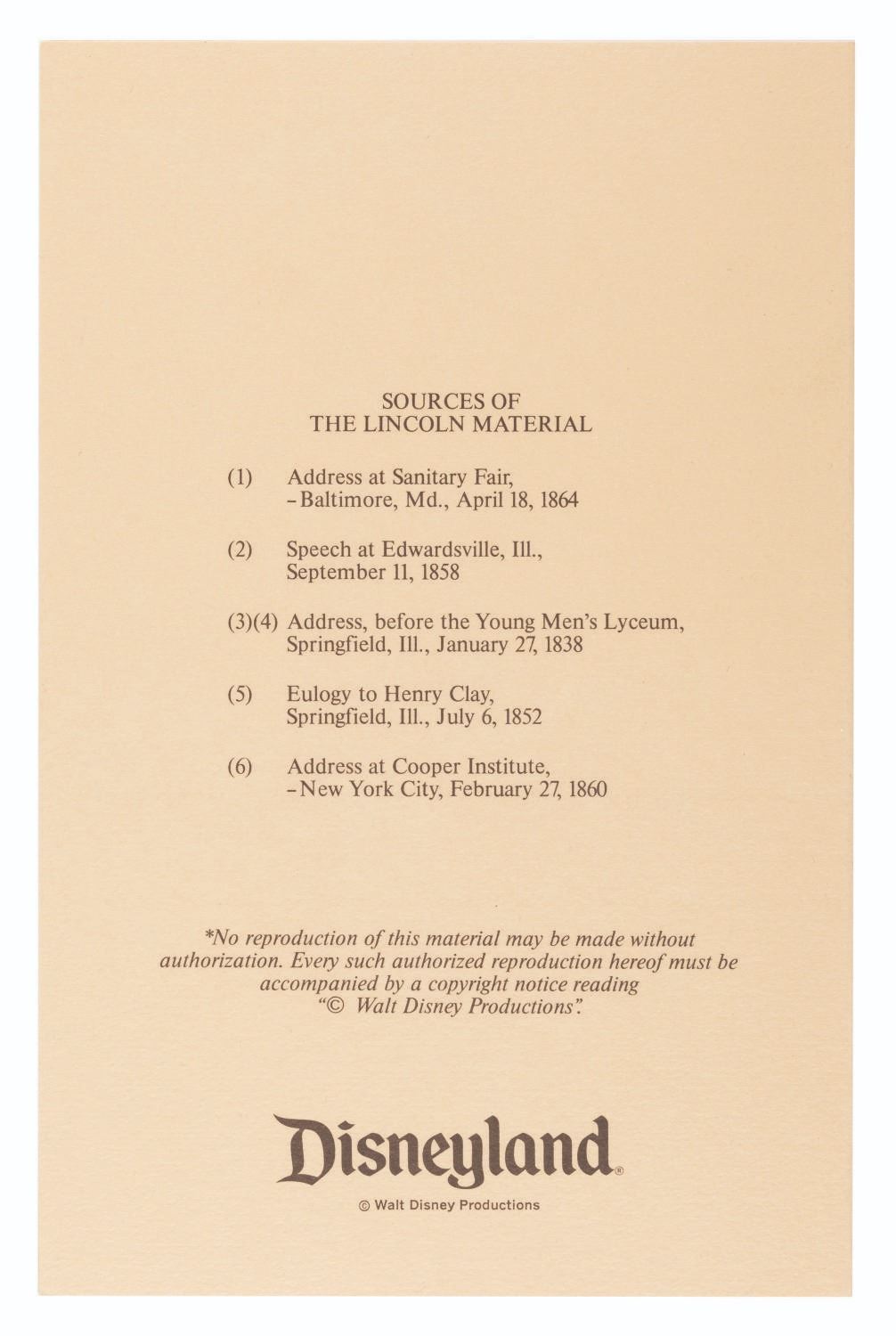 (Disneyland, 1970s-80s) A Great Moments with Mr. Lincoln souvenir program. Inside is the text of Lincoln’s speech from the attraction, as well as sources on the back. Measuring 5.5” x 8.5”, the program displays in fine condition with a small spot on the second “n” in “Lincoln.”
