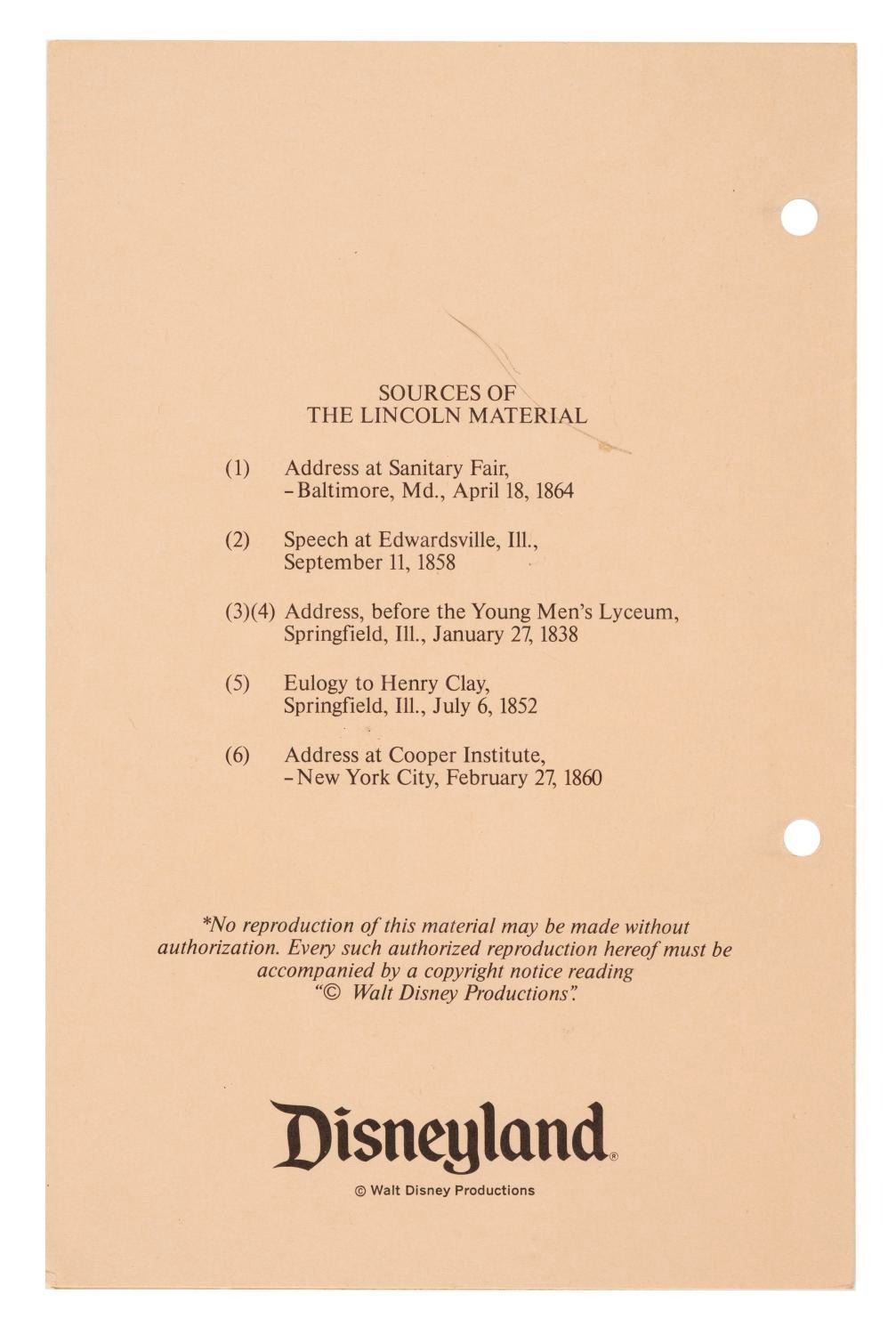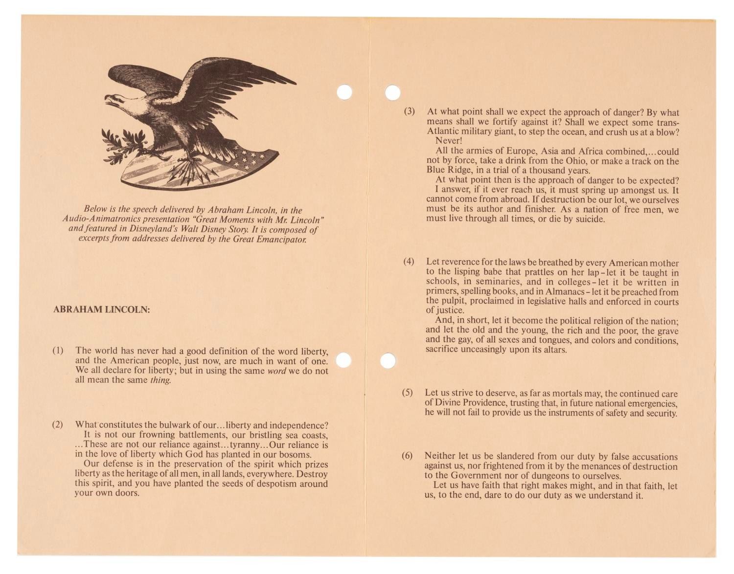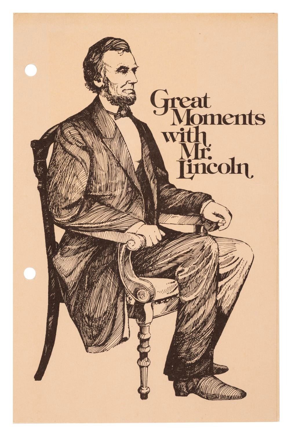 (Disneyland, 1970s-80s) A Great Moments with Mr. Lincoln souvenir program. Inside is the text of Lincoln's speech from the attraction, as well as sources on the back. Measuring 5.5" x 8.5", the program displays in very good condition, with two holes punched to place in a binder.