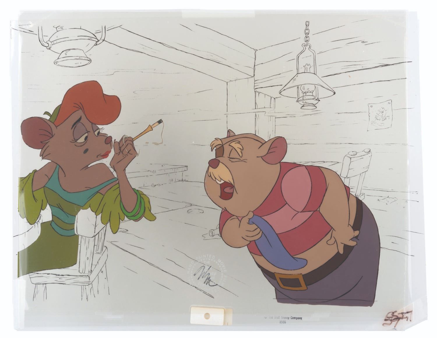 (Disney, 1986) An original multi-layer production cel of Dawson and the smoking mouse from "The Great Mouse Detective.” The cel has been placed over a matching background established in line work on a secondary cel. The characters have an image size of 8.5” x 14” on 12” x 16” cel layers. The piece displays in good condition with minor lifting to the paint around the edges of the character image, and a staple in the top left corner with tape at several points around the edges. The cel layer of Dawson appears to have vinegar syndrome and may have been laminated.
