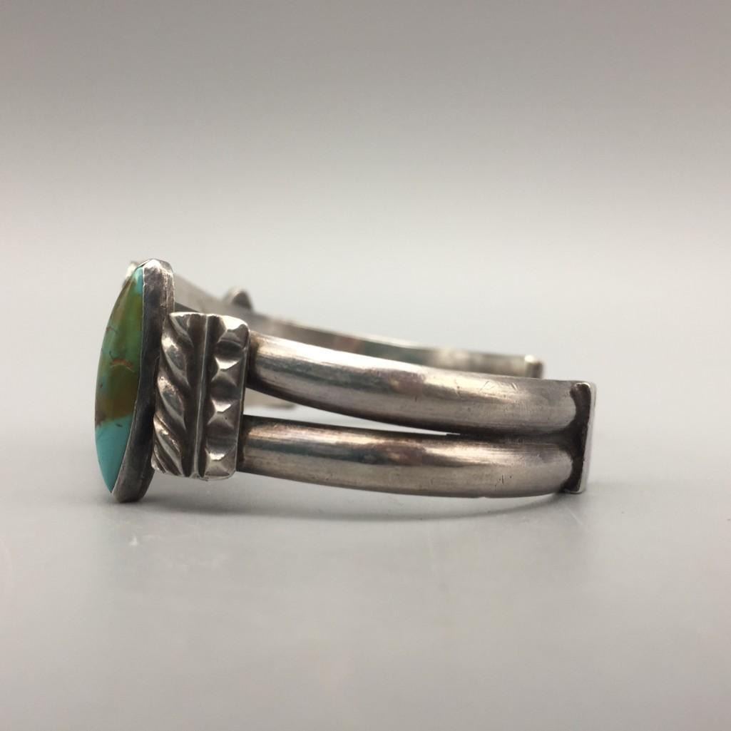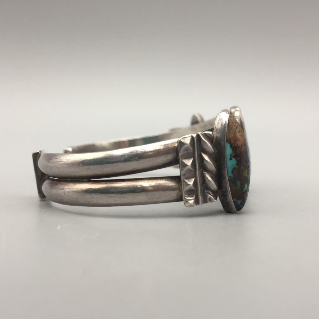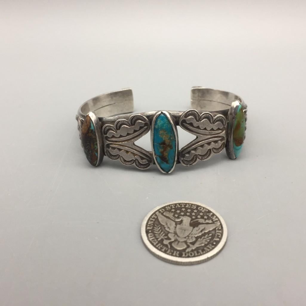 Description: Offered here is a beautiful, 1930s era turquoise and sterling silver cuff bracelet. It is set with three natural turquoise stones (probably old Cerrillios mine stones). It has nice, handmade designs accenting it and has a nice sturdy feel to it. Maker: Unmarked. Approx. Age: Circa 1930s. Size: Inside circumference measures approx. 5-3/4 inches with an additional 1 inch opening (making it fit an approx. 6-3/4 inch wrist.) It is 7/8 inches wide at its widest part and weighs 40.5 g. Condition: Pretty good for its age. Normal wear and minor imperfections expected on used and vintage items. Please look closely at the pictures as they are an important part of our description. Shipping: There will be a $5 handling / packaging fee for shipping this lot. The actual cost of postage will be added on top of that. BUY IT NOW: If you would like to buy this item now without waiting for the auction to end (this option is only available up to 48 hours before the auction starts to close), the “Buy it Now” price is the high estimate of this lot. If you would like to end the auction early and pay the high estimate (plus applicable fees), please contact us by phone or email and reference this lot number.