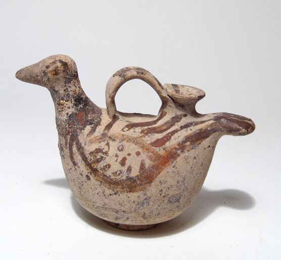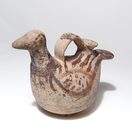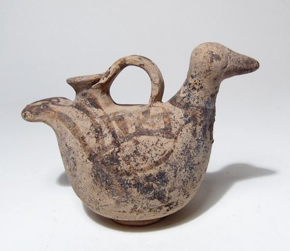 A Greek footed askos in the form of a bird, c. 5th - 4th Century BC, the body decorated with brown slip, the eyes and beak also detailed with a wide collar around the neck. H: 3 1/2 in (8.9cm), L: 4 4/5 in (12.2cm). Intact, scattered mineral deposits. Ex South German private collection of an artist and art collector, purchased between 1960 to 1980.
