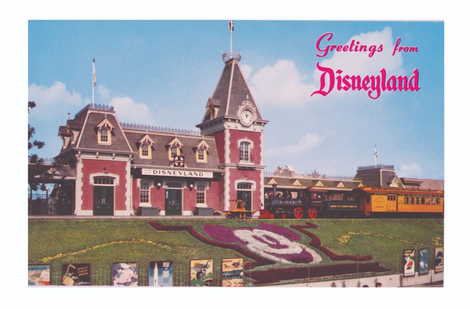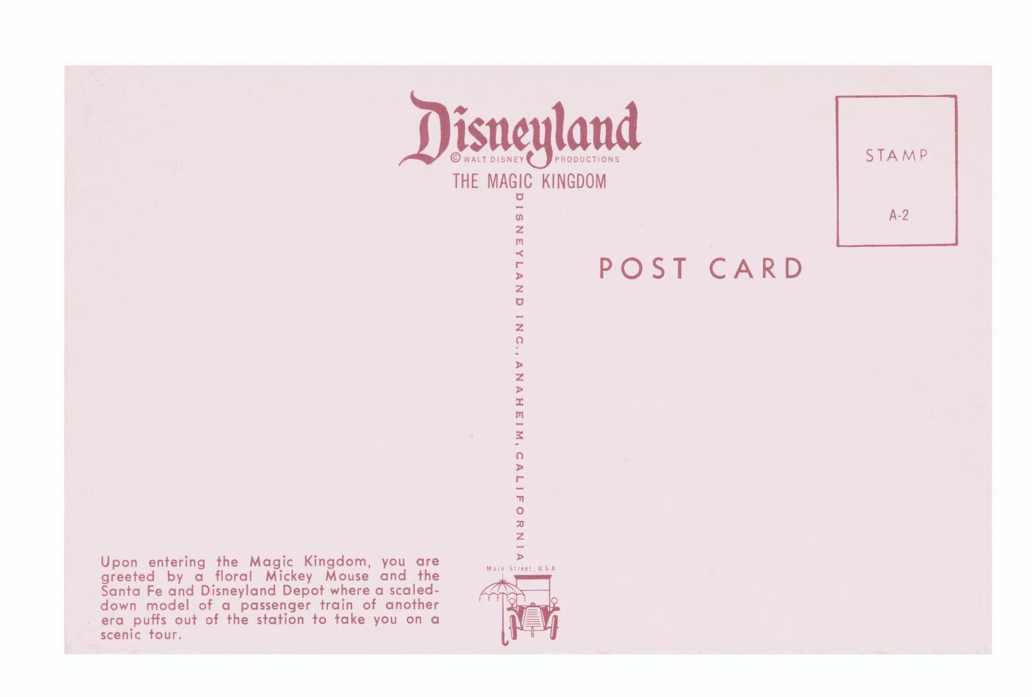 (Disneyland, 1950s-60s) A Greetings from Disneyland postcard showing the earliest attraction posters in front of Floral Mickey and the Main Street train station. Measuring 3.5" x 5.5", the postcard is in fine condition.