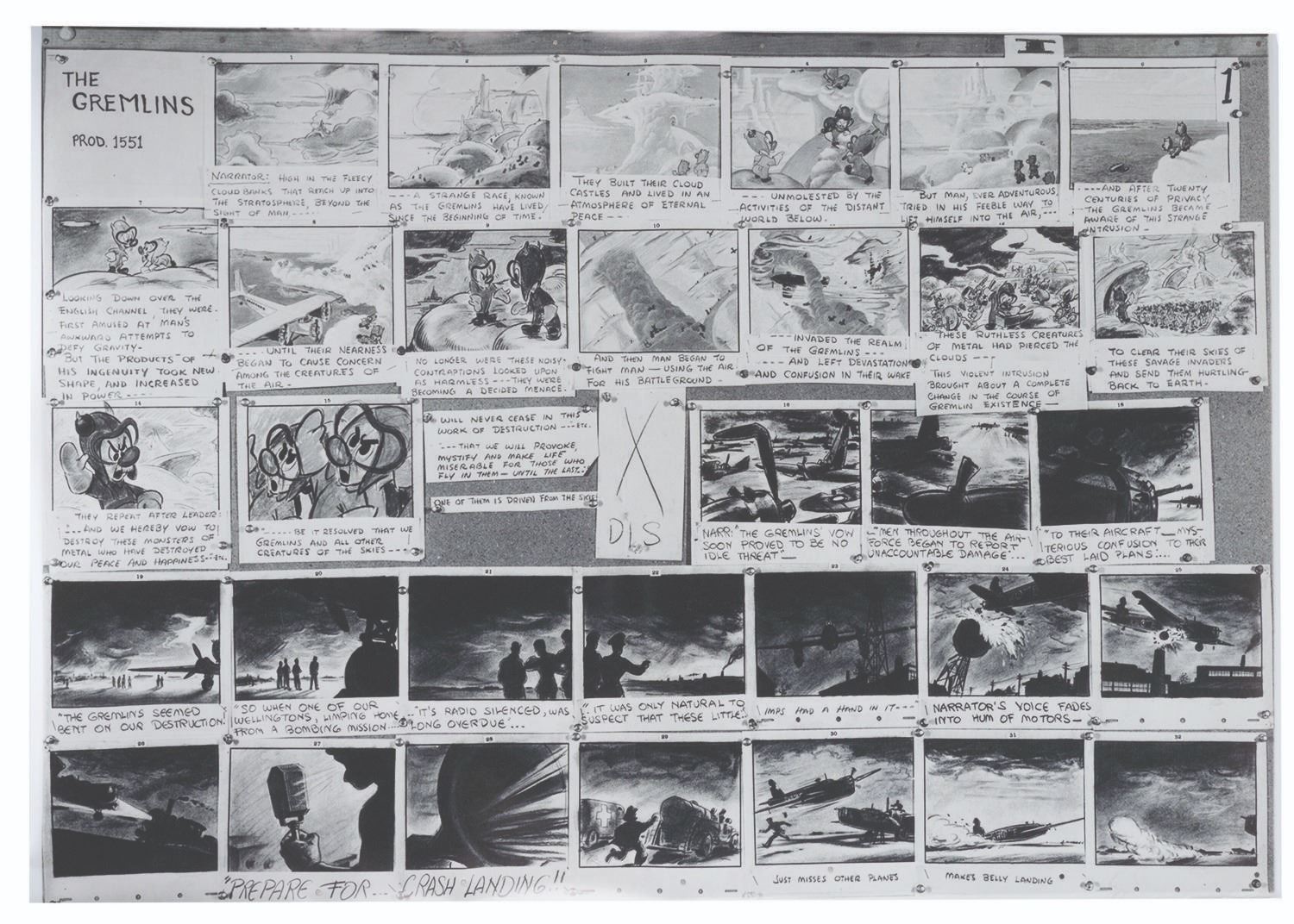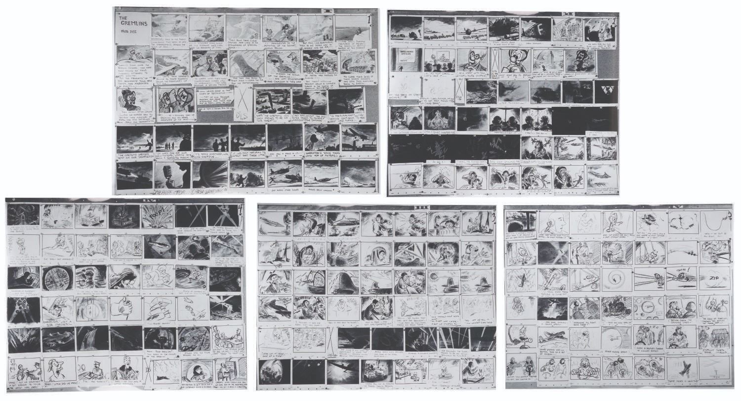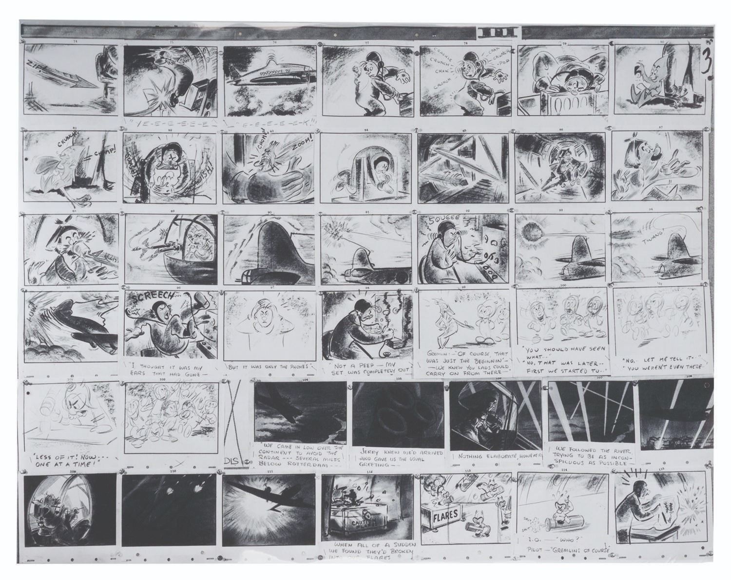 (Disney, 1990s-2000s) A group of five large glossy storyboard prints for the 1940s animated film "Gremlins," based on the story by Roald Dahl. The project was never completed, but these storyboards provide a rare glimpse at the making of the project. Measuring 42" x 60" each, the rolled storyboards are in very good condition with light wear, minor creases, and some discoloration along the edges.