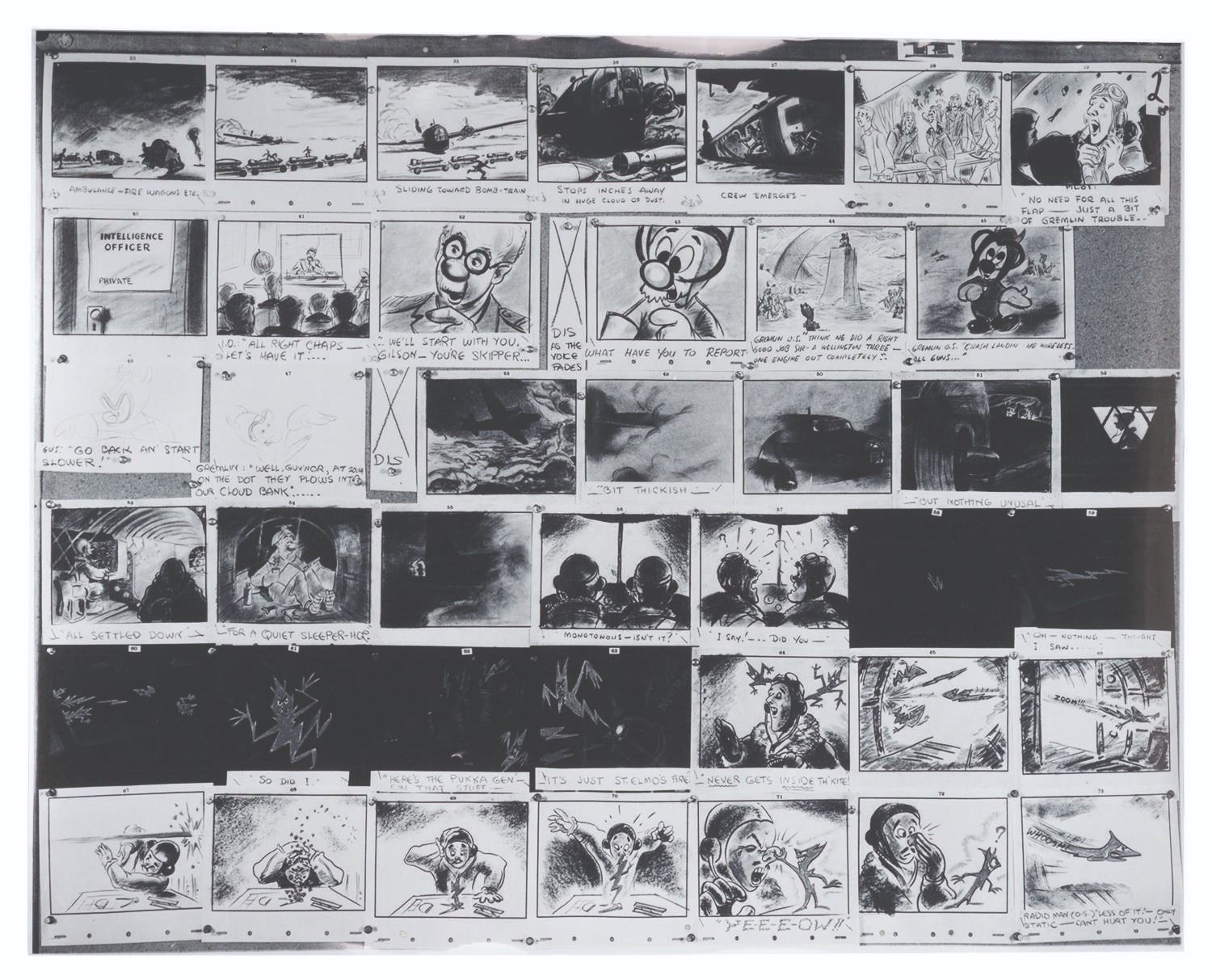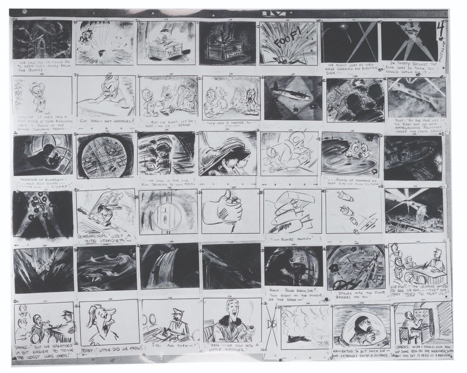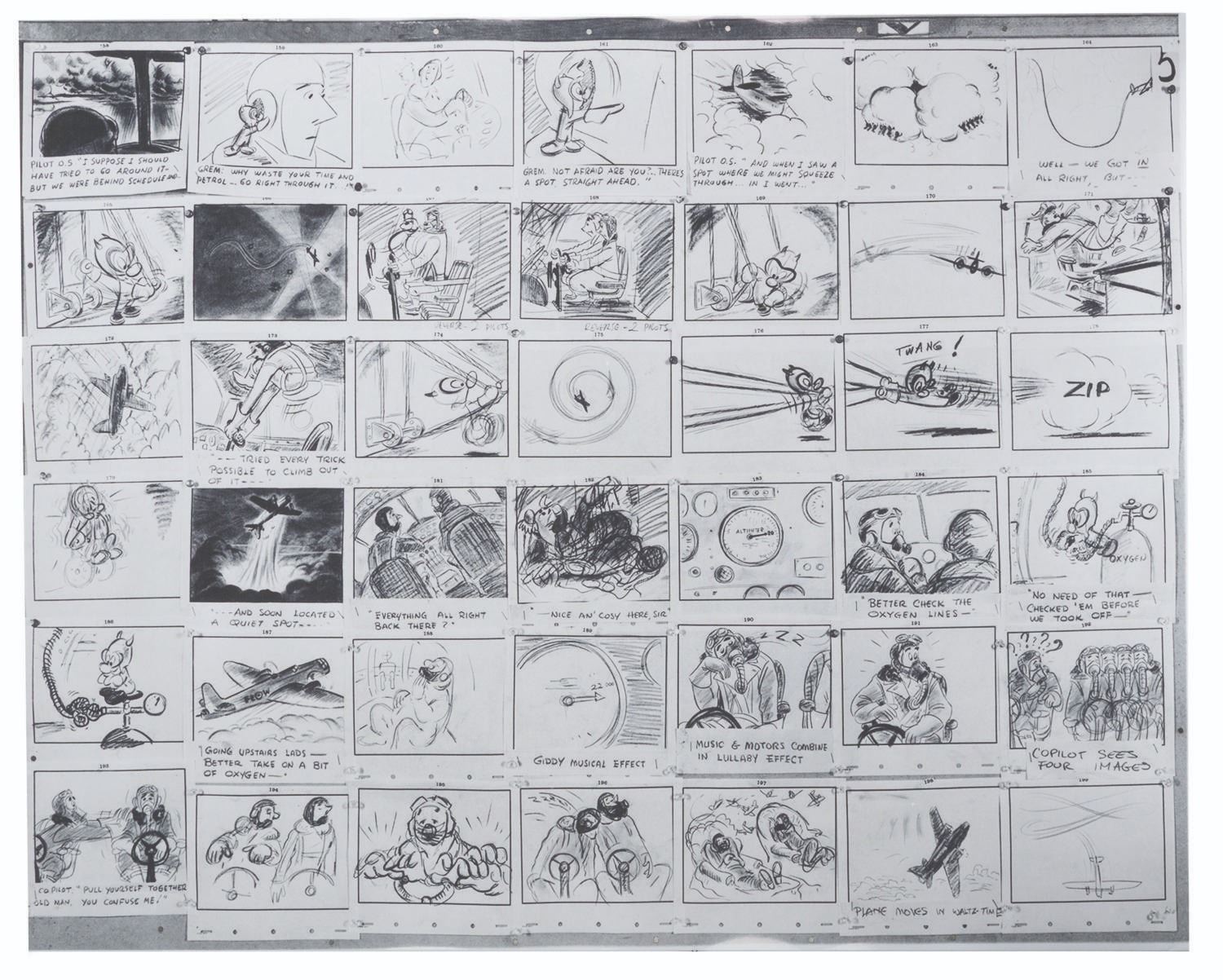 (Disney, 1990s-2000s) A group of five large glossy storyboard prints for the 1940s animated film "Gremlins," based on the story by Roald Dahl. The project was never completed, but these storyboards provide a rare glimpse at the making of the project. Measuring 42" x 60" each, the rolled storyboards are in very good condition with light wear, minor creases, and some discoloration along the edges.